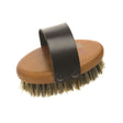 金/黒/ベージュの毛と革のストラップを備えた日焼け木製の楕円形のボディブラシ。