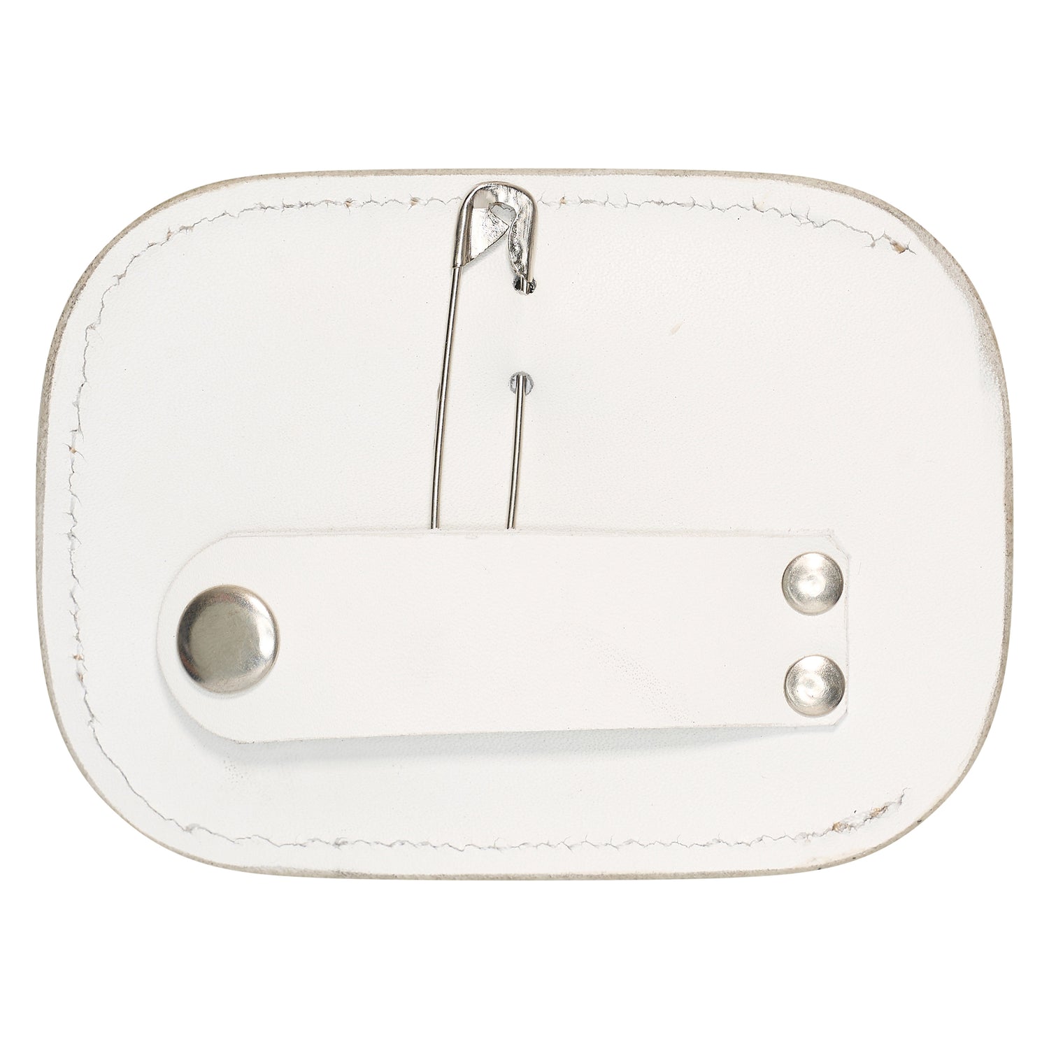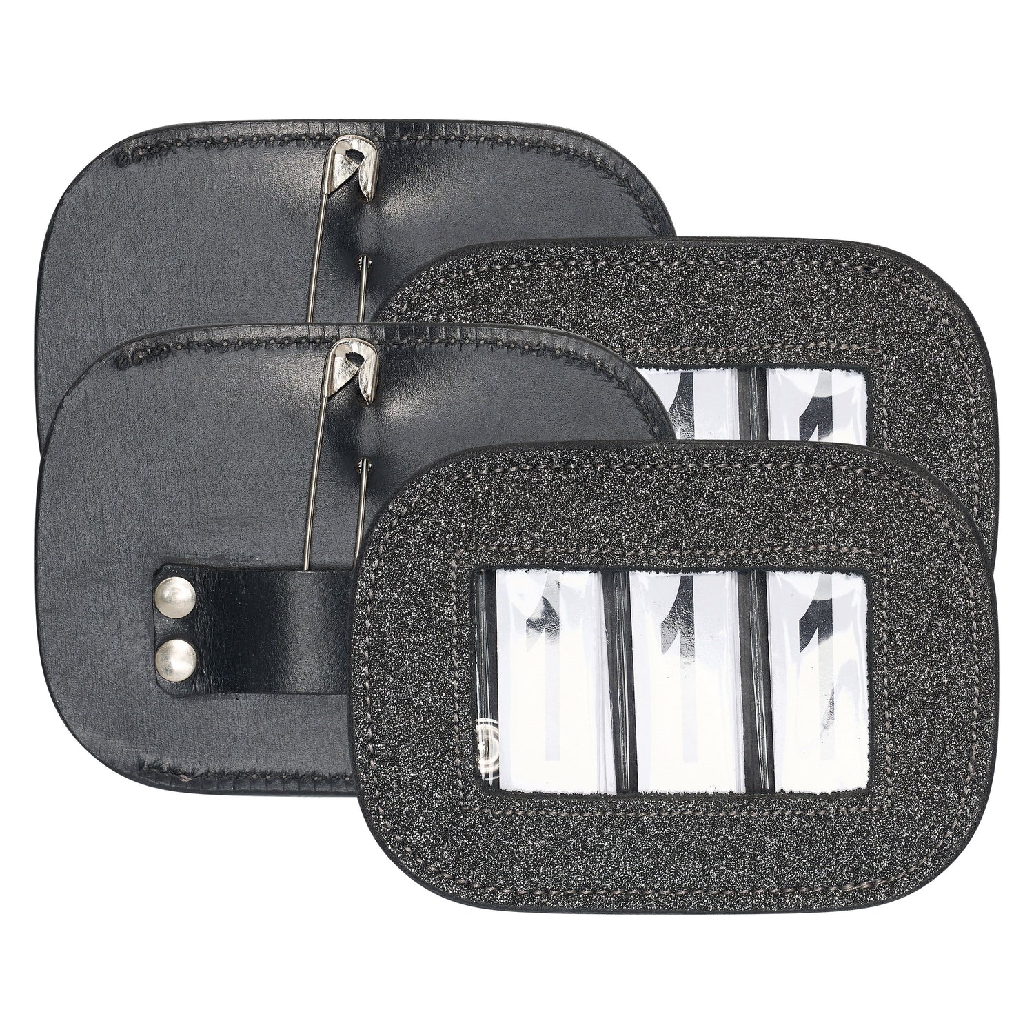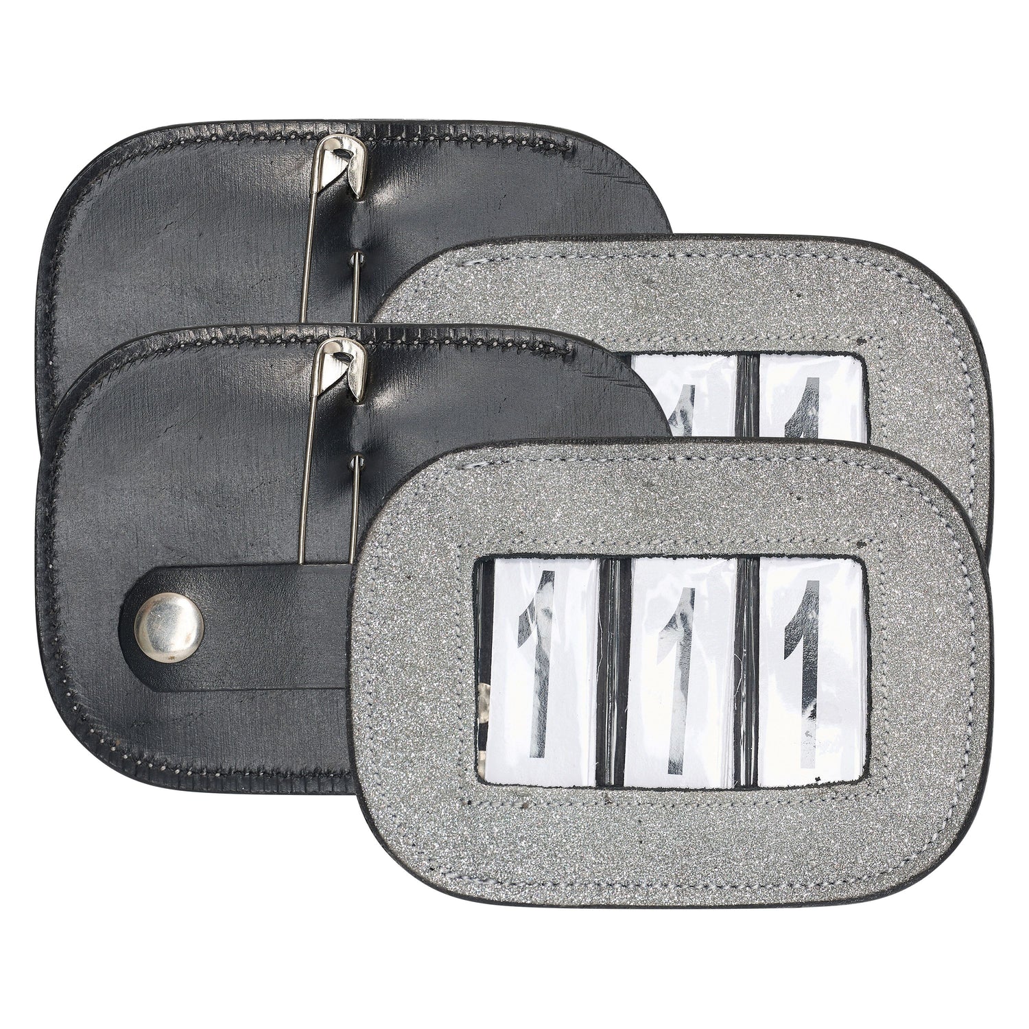 The square version of the glitter competition numbers combines a shiny front with practical safety pin and snap button closures. They hold up to three digits and come in a set of two.