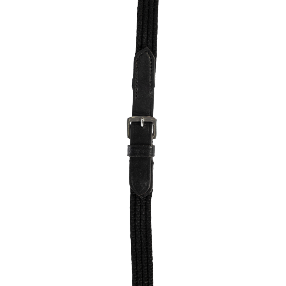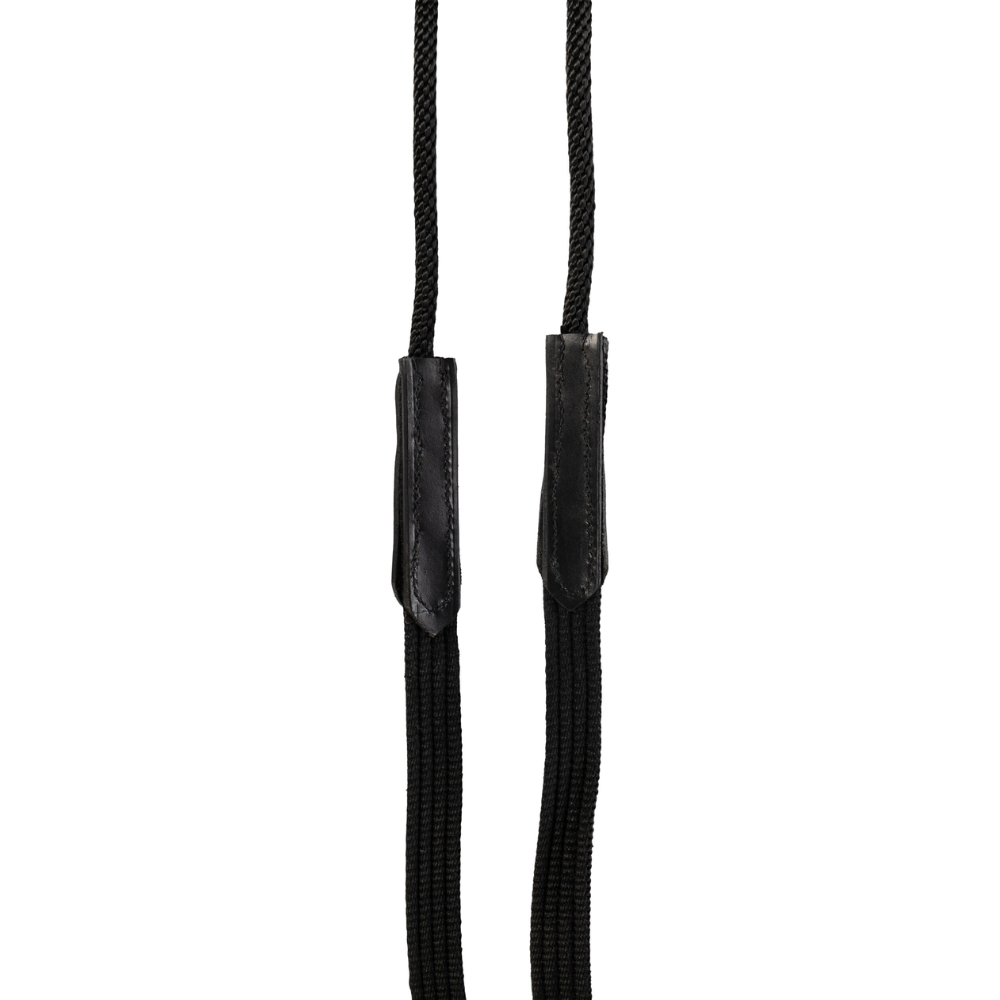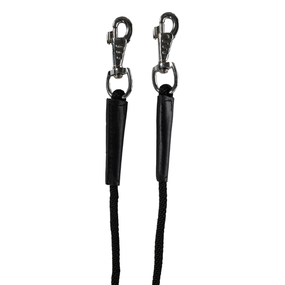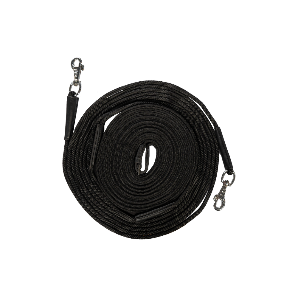 The double lunge Slim is the ideal aid for effective lunging and ground work. Made from sturdy webbing, it offers reliable handling and a total length of 18 metres. The lunge line can be split in the middle and is equipped with snap hooks, making it flexible to use. The ends are fitted with a round nylon cord for smooth guidance. In a classic black colour, the double lunge impresses with its functionality and durability.