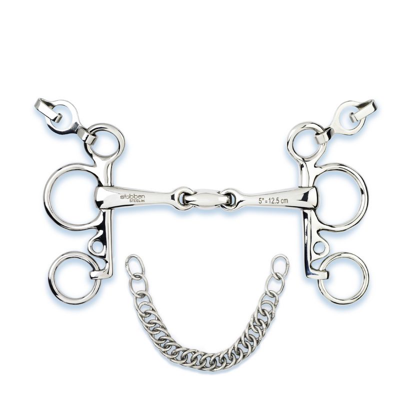 The Pelham's versatility is further enhanced by its ability to be used with one or two reins, allowing for adjustable leverage and pull effects. The short shanks of the Stübben STEELtec Pelham are specifically designed for rapid, direct impact with minimal rein movement, crucial for navigating tight turns in jumping courses.