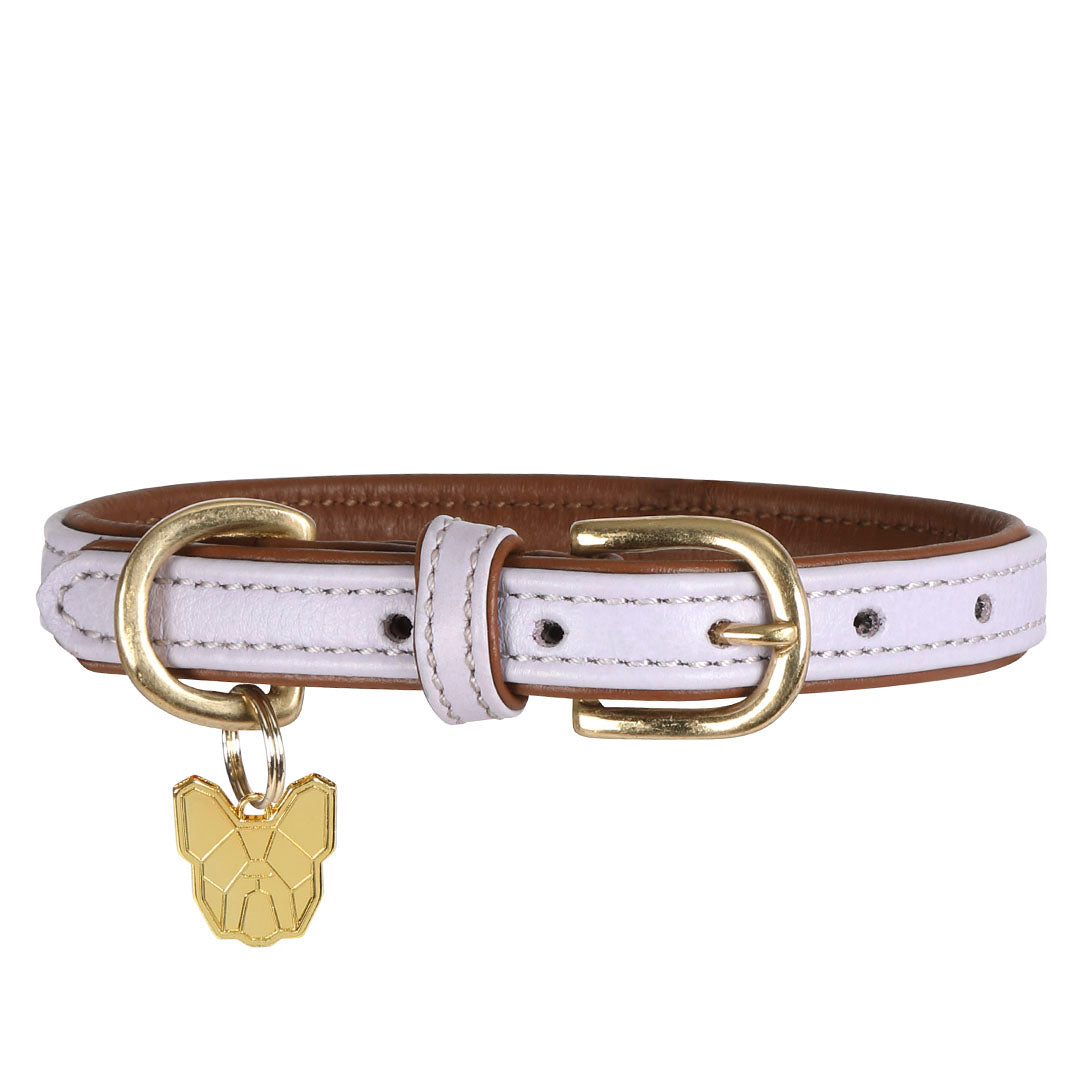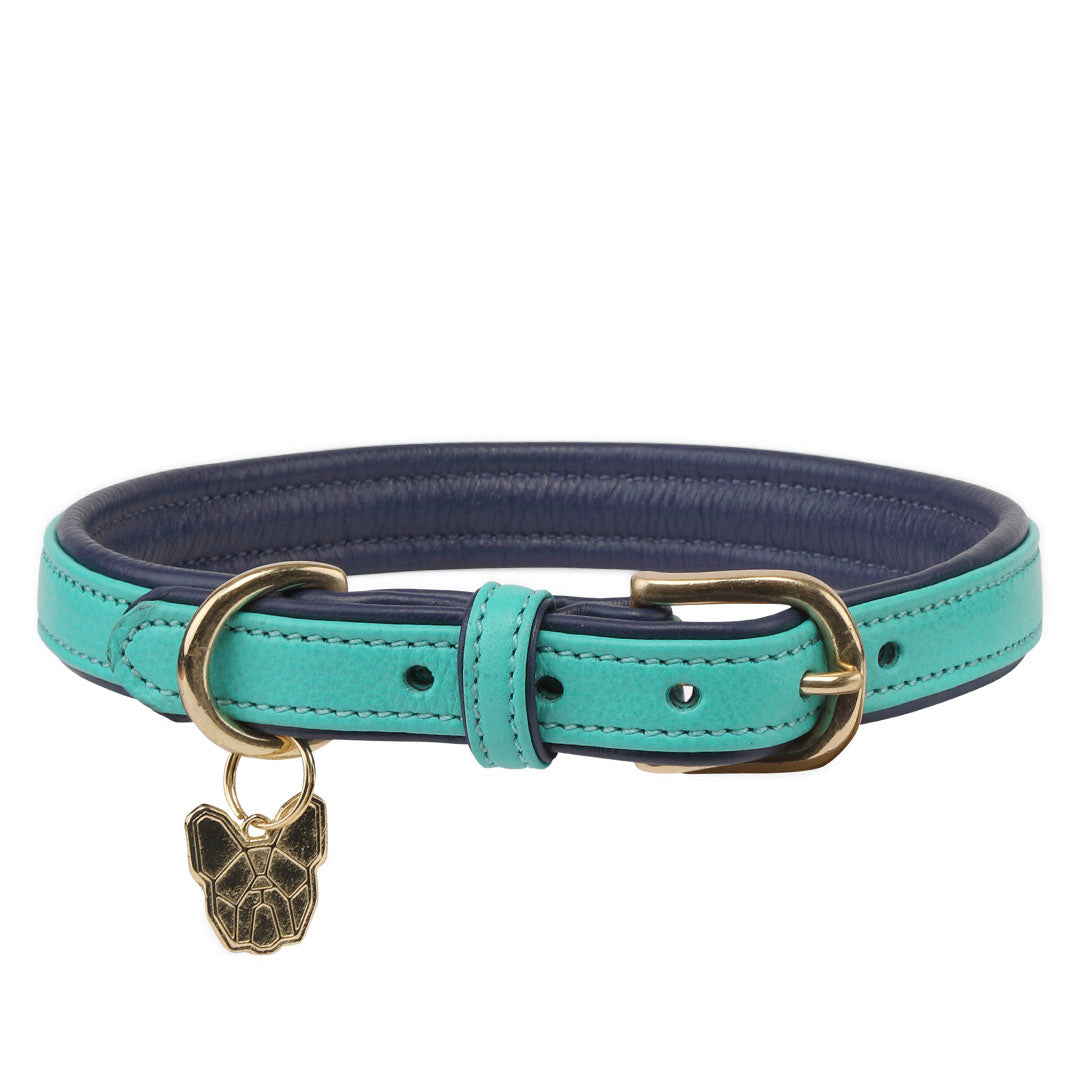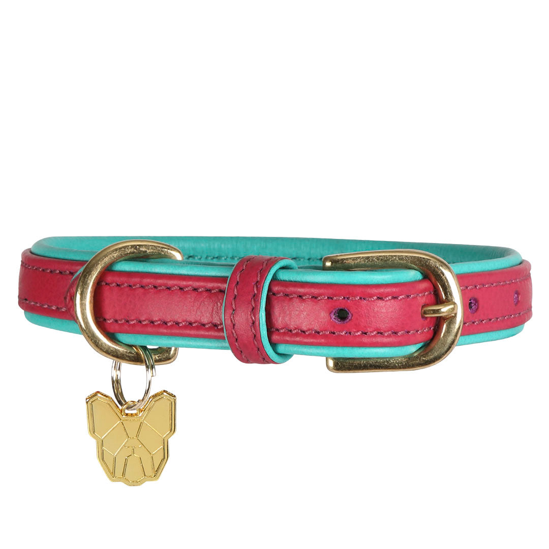 Eine farbenfrohe Kollektion aus gefaltetem Leder, gefüttert mit weich gepolstertem Leder für mehr Komfort. Das gepolsterte Hundehalsband aus Leder ist mit einer messingfarbenen Schnalle und einem D-Ring sowie dem Digby & Fox-Tag versehen.