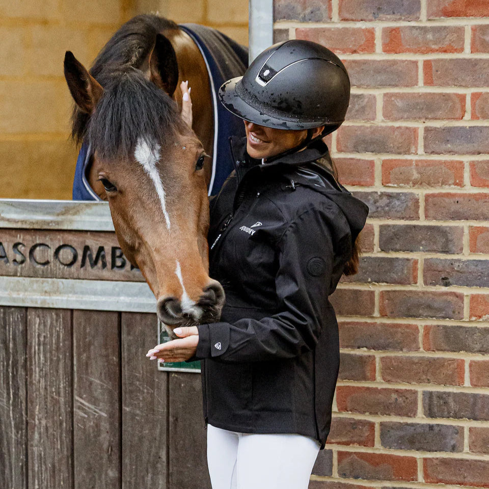 Stay dry and stylish with this high-performance equestrian jacket, designed with a 20,000mm waterproof rating and 7,000 breathability for exceptional protection against the elements. The lightweight matte ripstop outer provides durability, complemented by sophisticated subtle branding for a refined finish. Practical features include an adjustable stowaway hood, waterproof 2-way zip, multiple waterproof pockets, and rear saddle vents for comfort and flexibility. Adjustable cuffs and a regular fit ensure versatility, making this jacket equally suited to performance and everyday wear. A perfect choice for riders seeking quality, comfort, and style in all conditions.