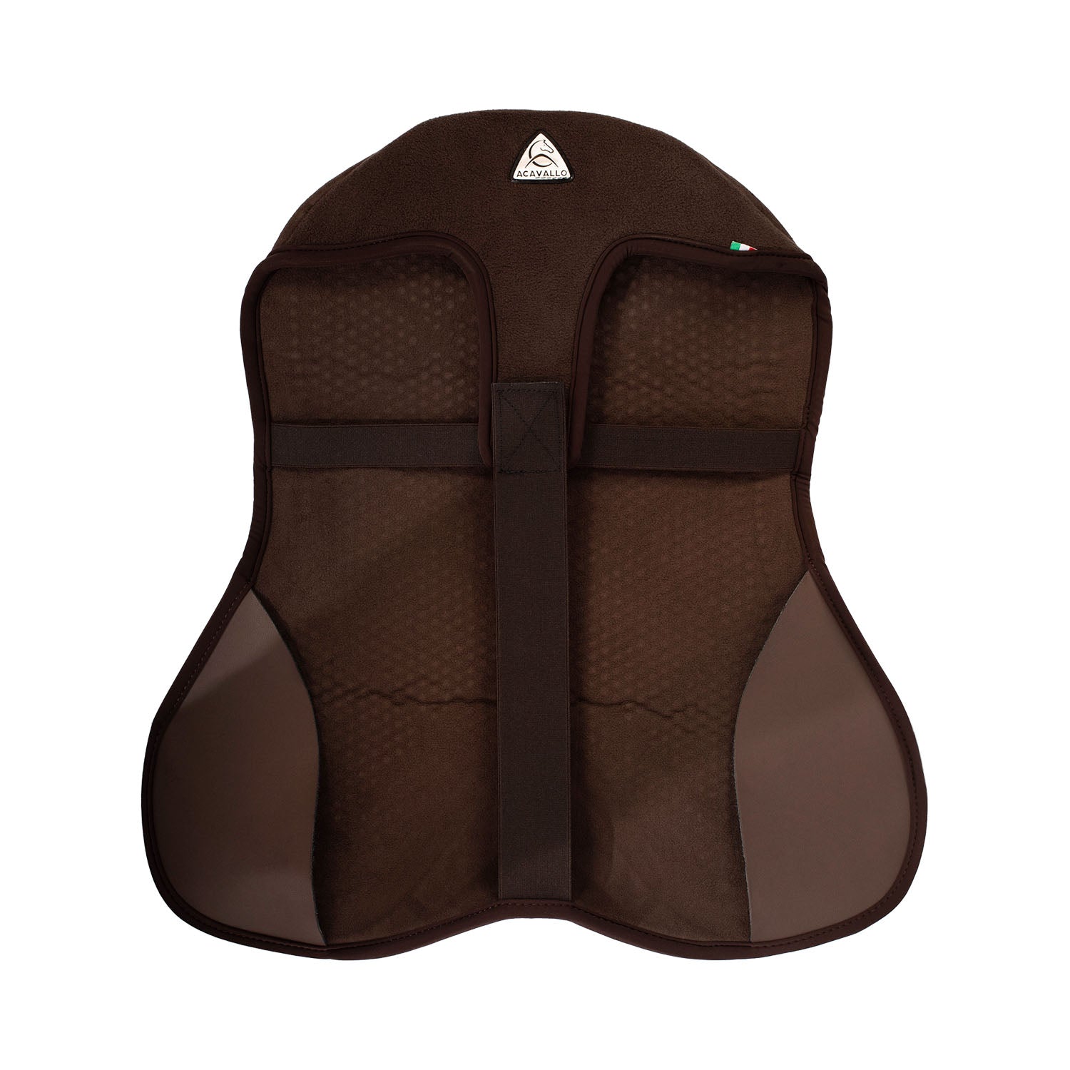 The Acavallo Standard Seat Saver Dressage Classic Gel-Out Dri-Lex 10mm enhances rider comfort and safety by combining advanced shock-absorbing gel technology with breathable Dri-Lex fabric. Its 10mm therapeutic gel layer supports the upper body, reducing pelvic and back strain during intense movements. Designed with elastic and grip straps, it securely attaches to the saddle without altering its natural position, ensuring stability throughout your ride. Ideal for dressage riders seeking superior cushioning and protection.