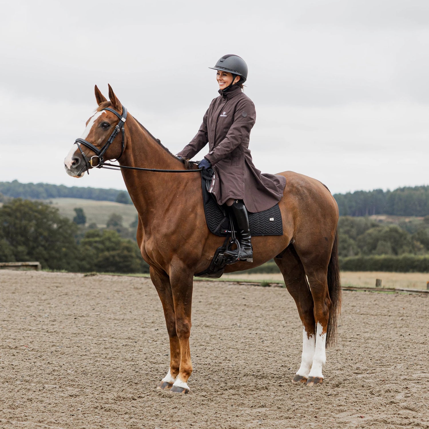 Part of the EQUIDRY fitted range, the Bronte is the perfect blend of elegance, performance, and practicality. Designed to keep you warm, dry, and stylish, this long, tailored coat sits beautifully over the saddle, offering full coverage and protection from the elements.