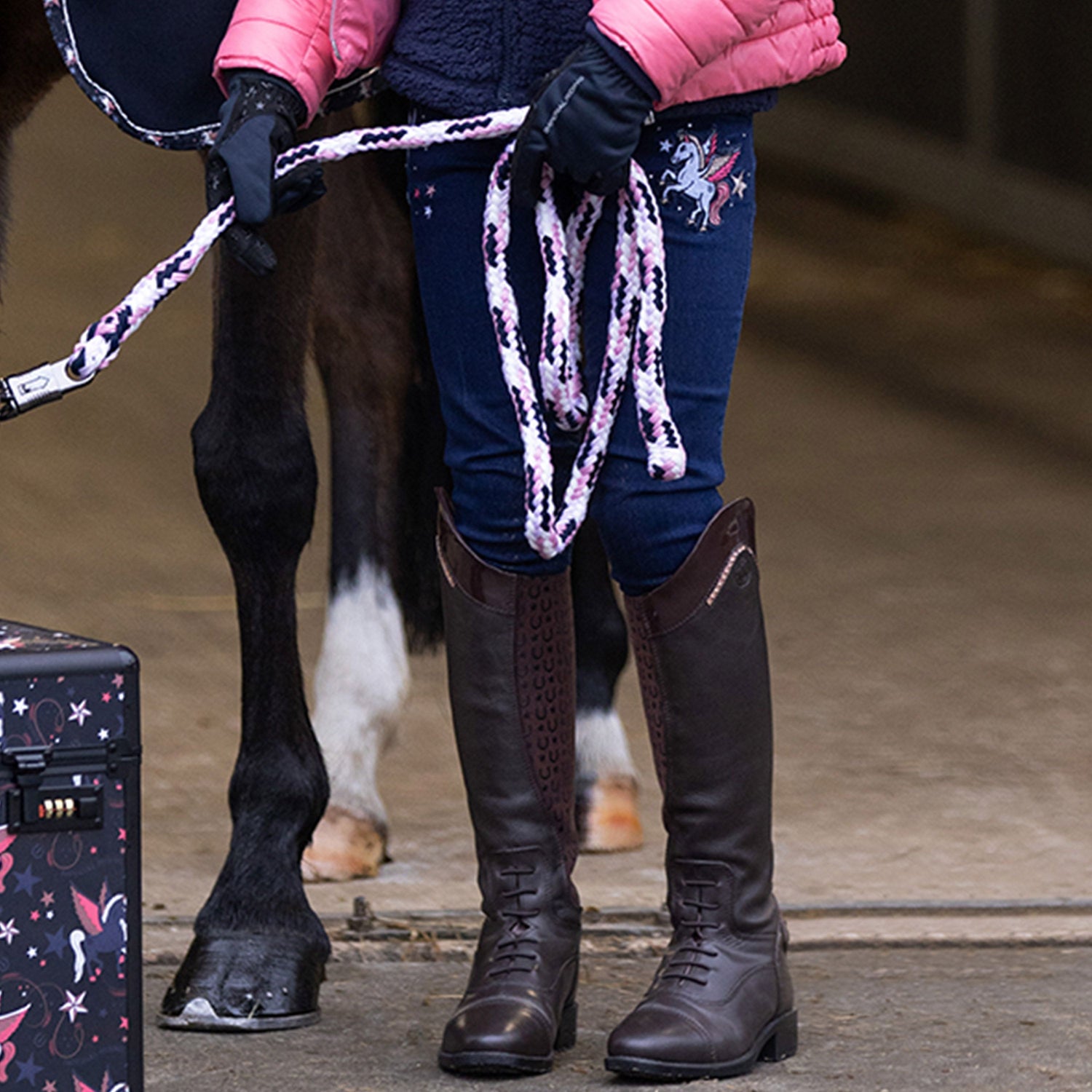 Upgrade your riding wardrobe with the latest innovation: five-pocket denim riding breeches! Featuring a zipper fly and hook and eye closure for a secure fit, these breeches also include elasticated inserts at the bottom leg for maximum comfort. But the true standout feature is the silicon full seat, providing extra grip and stability in the saddle. With beautiful embroidery and rhinestone-embellished artworks, as well as rhinestone pocket entrances, these breeches are both stylish and functional. Step up your equestrian game with denim riding breeches today!