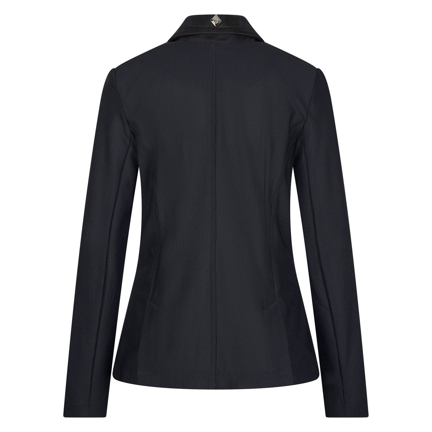 Crafted from ultra light, breathable fabric, the Imperial Riding Air Meshy Competition Jacket boasts a sleek, professional design. A covered zipper and three visible buttons secure the front, while mesh fabric is featured on the sleeves, collar, and lapel. Double weltpockets with covered zippers and a back slit add functionality, and the unlined design ensures maximum comfort. Along the edge, a satin fabric collar is adorned with a crystal Rhinestone button for a touch of elegance. Made from 4-way stretch fabric, this jacket provides both style and functionality for competition.