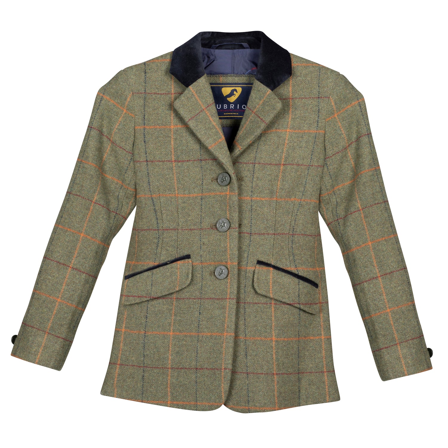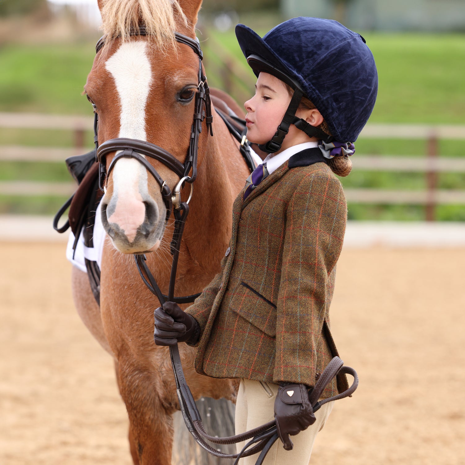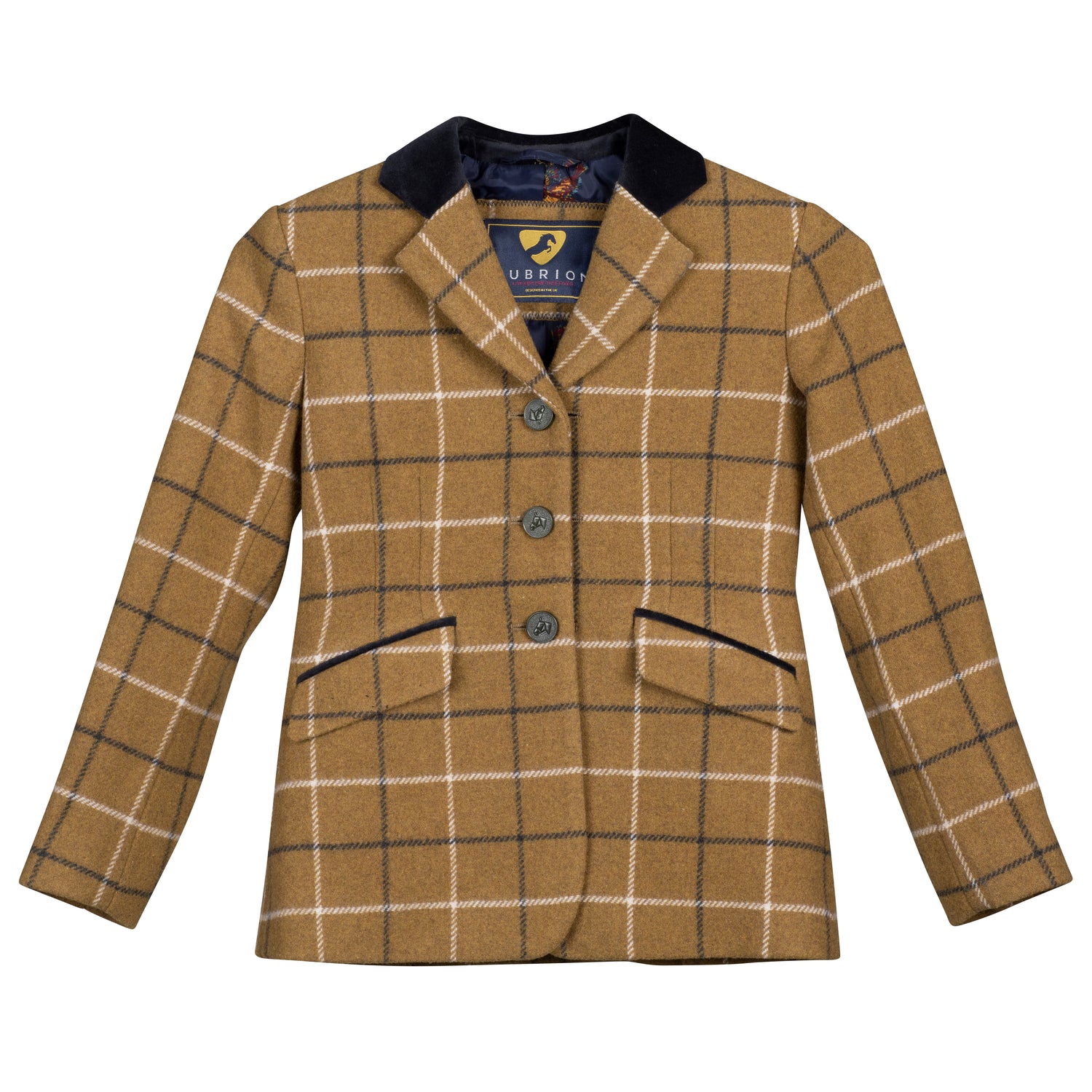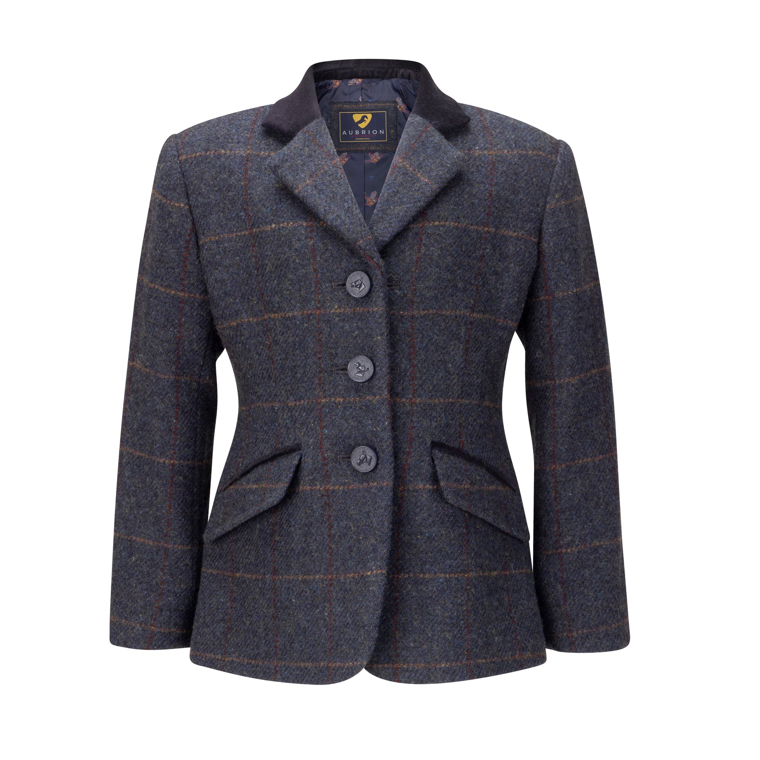 A traditional classic show jacket with a fresh, modern fit in wool mix tweed checks. Style detail: tailored to flatter, velvet trim collar and pockets, double rear vents, horse button details, two flap pockets, pheasant print lining, Aubrion brand. Double fastening for boys or girls.