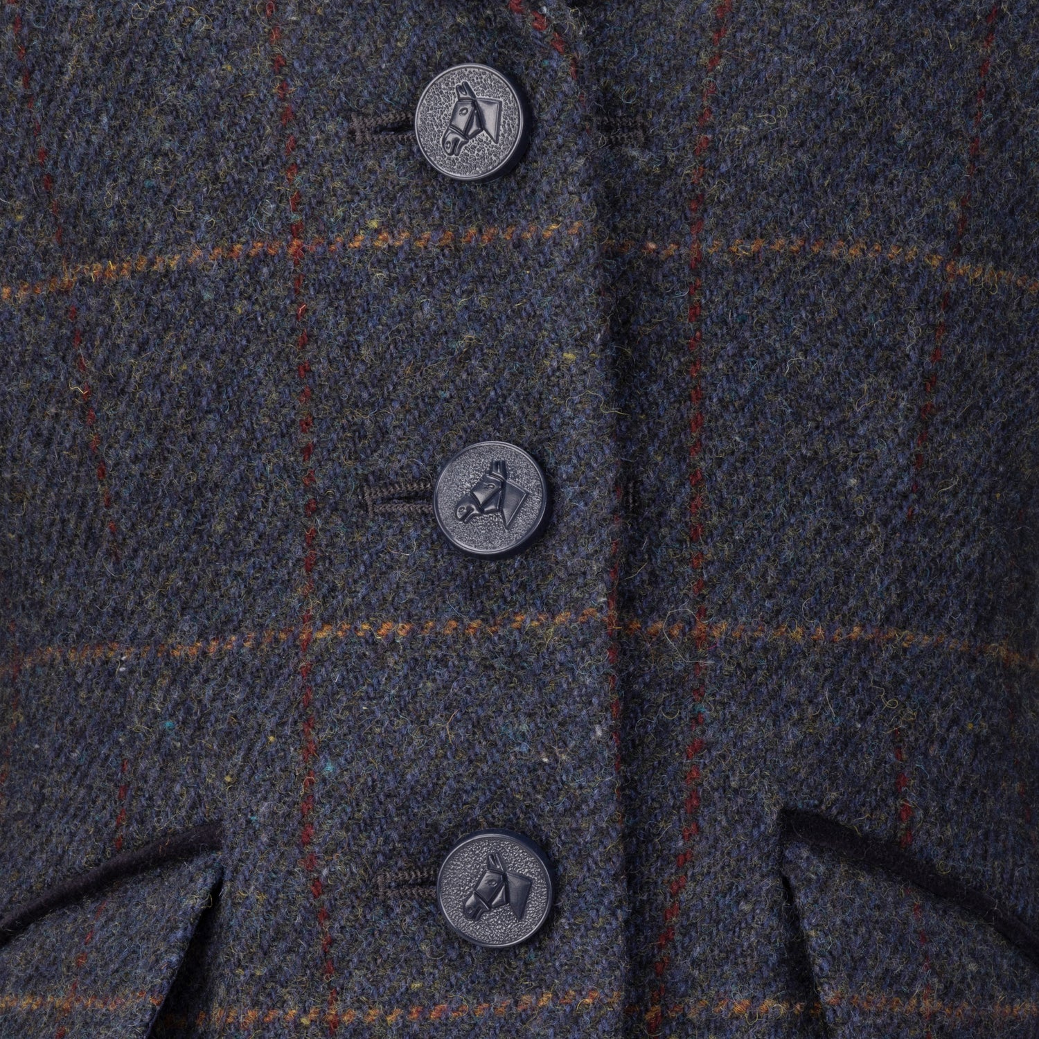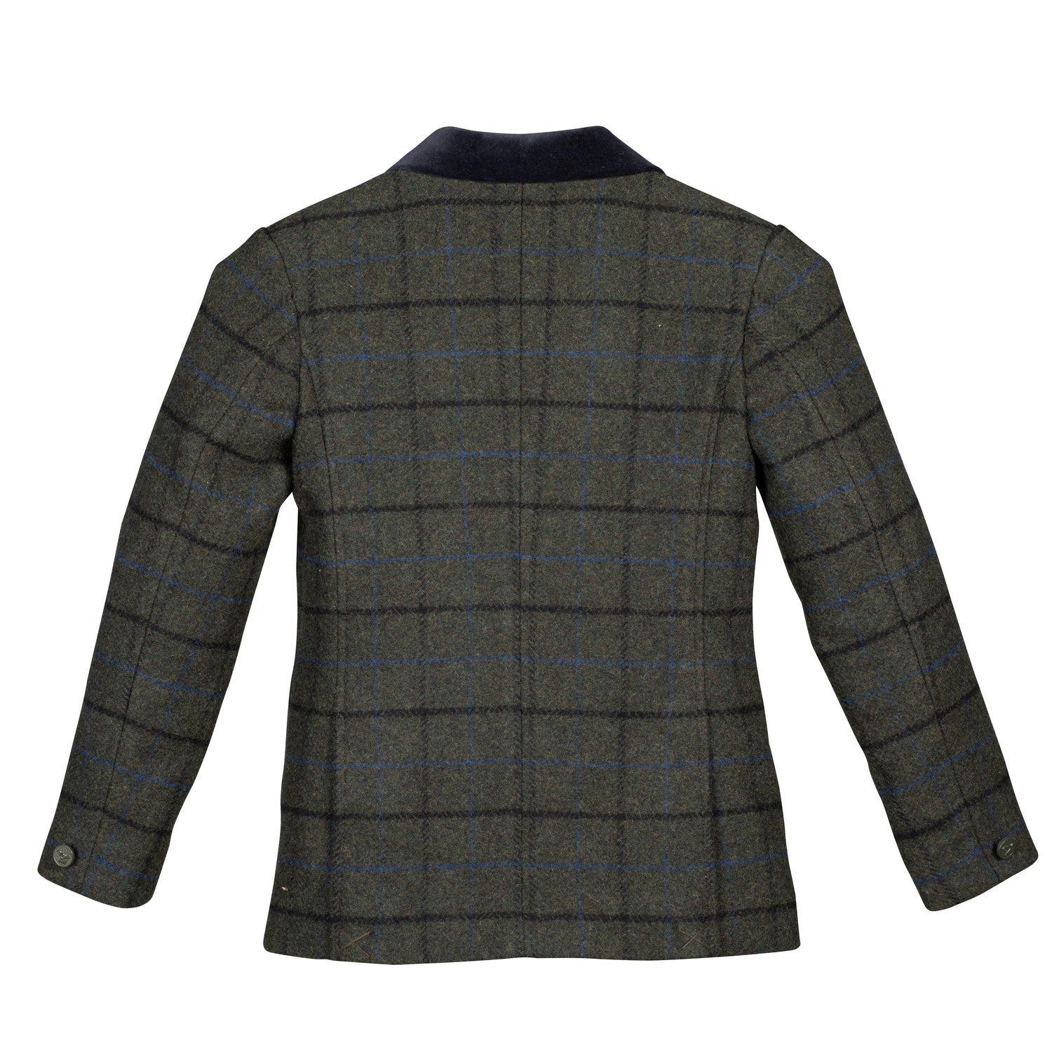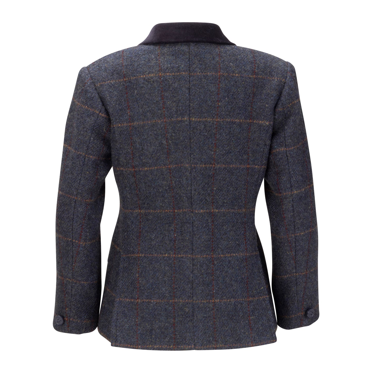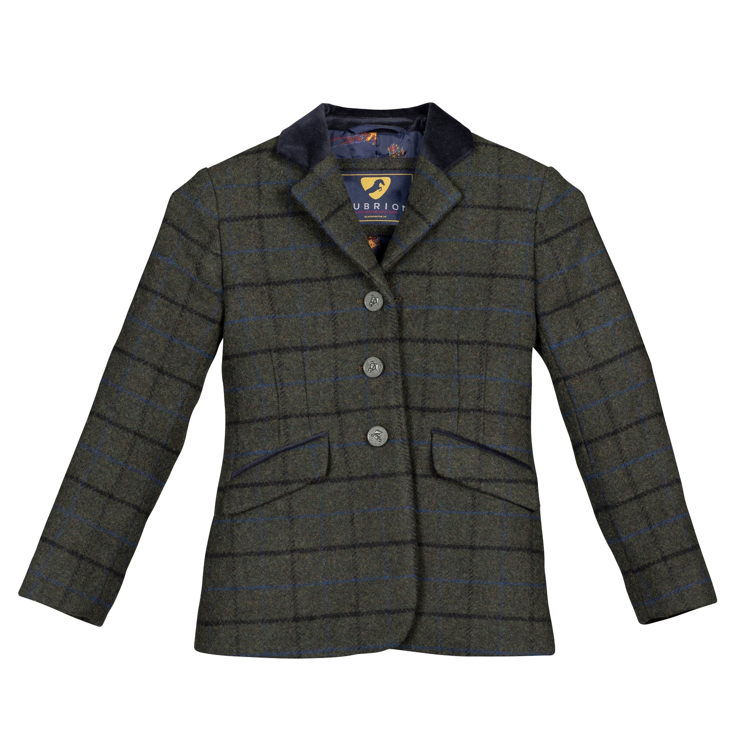 A traditional classic show jacket with a fresh, modern fit in wool mix tweed checks. Style detail: tailored to flatter, velvet trim collar and pockets, double rear vents, horse button details, two flap pockets, pheasant print lining, Aubrion brand. Double fastening for boys or girls.