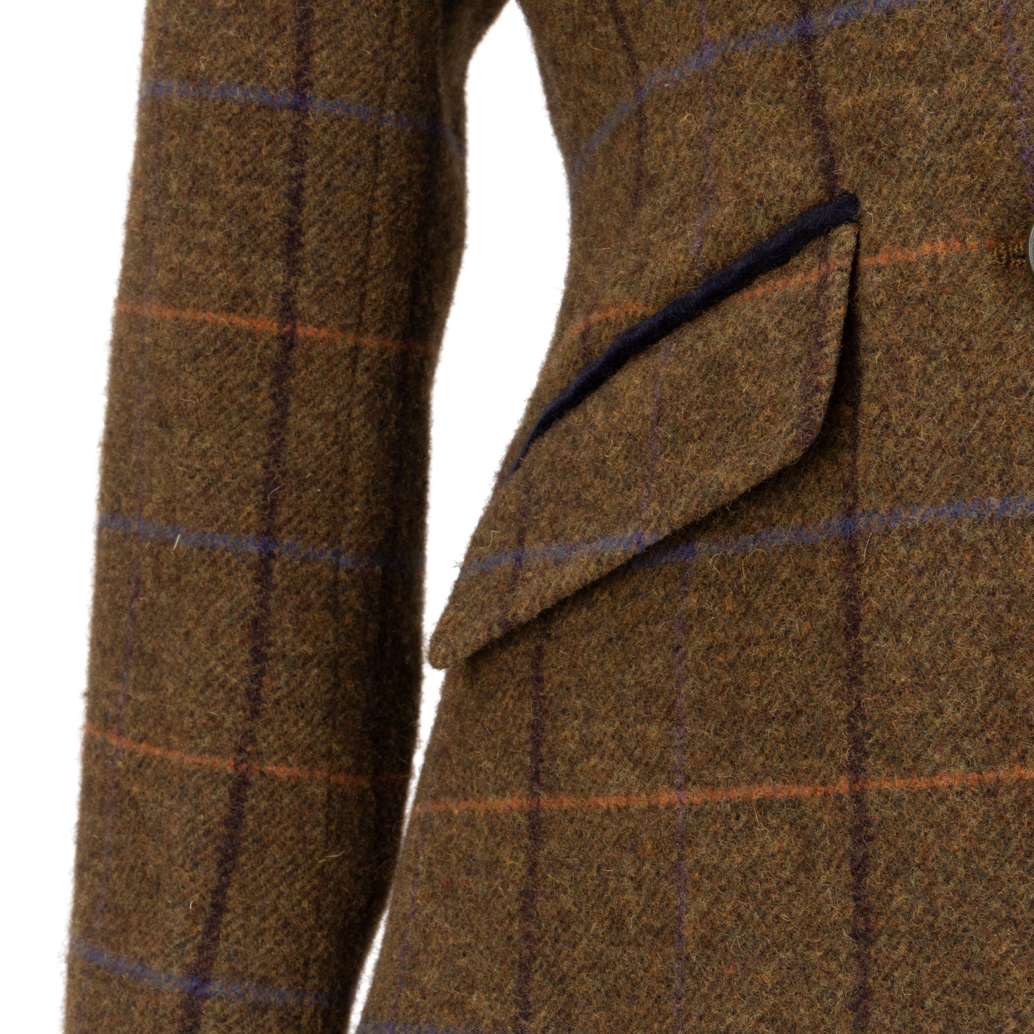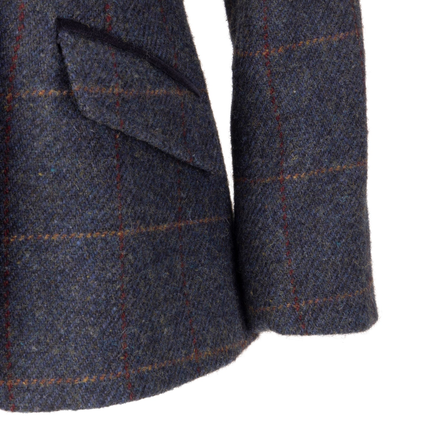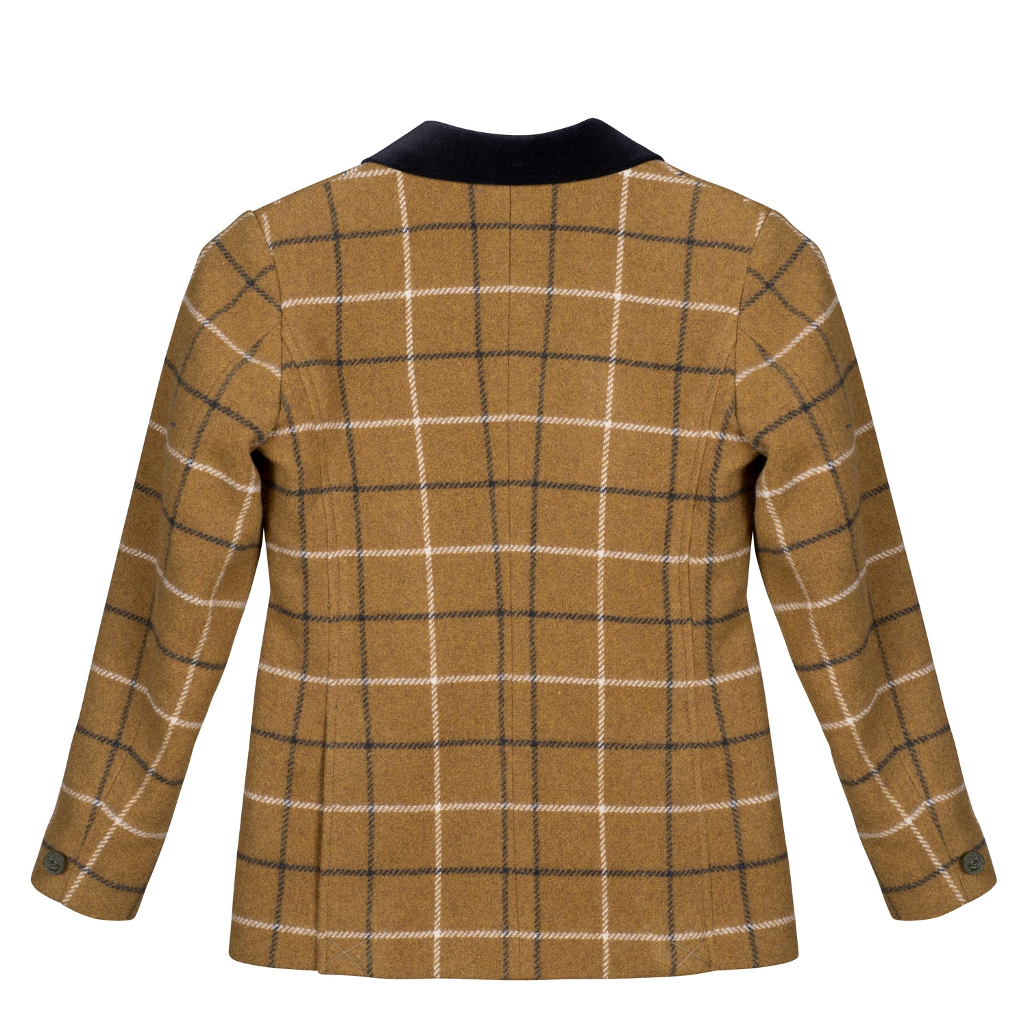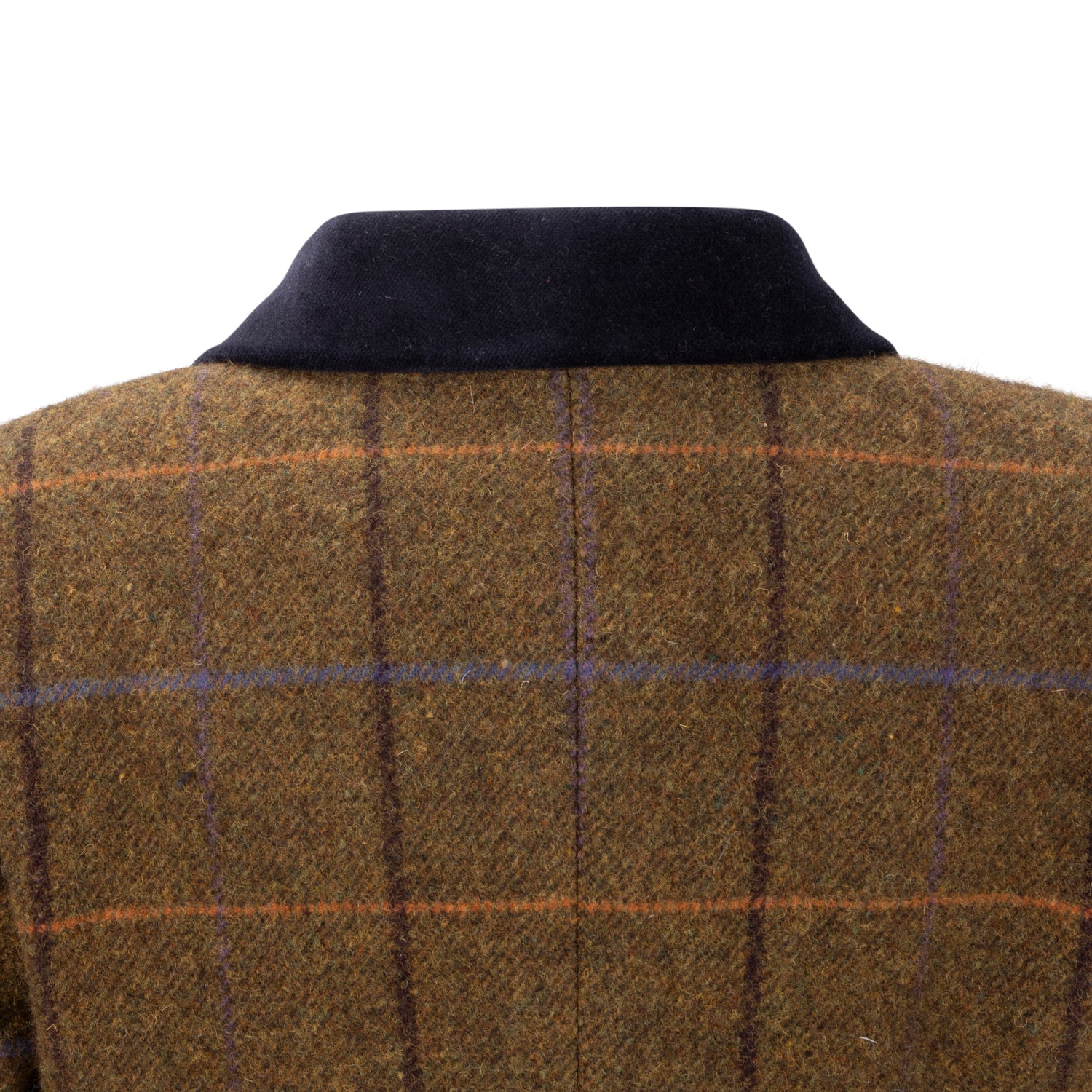A traditional classic show jacket with a fresh, modern fit in wool mix tweed checks. Style detail: tailored to flatter, velvet trim collar and pockets, double rear vents, horse button details, two flap pockets, pheasant print lining, Aubrion brand. Double fastening for boys or girls.