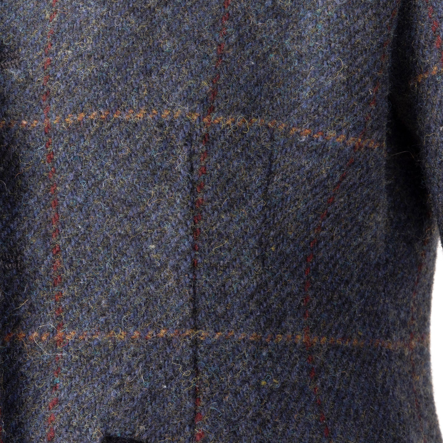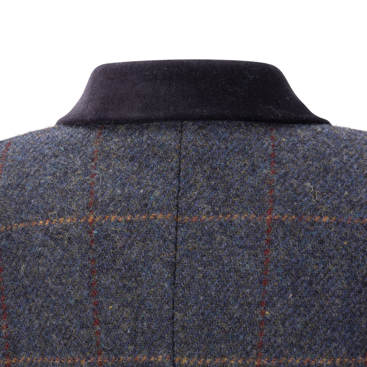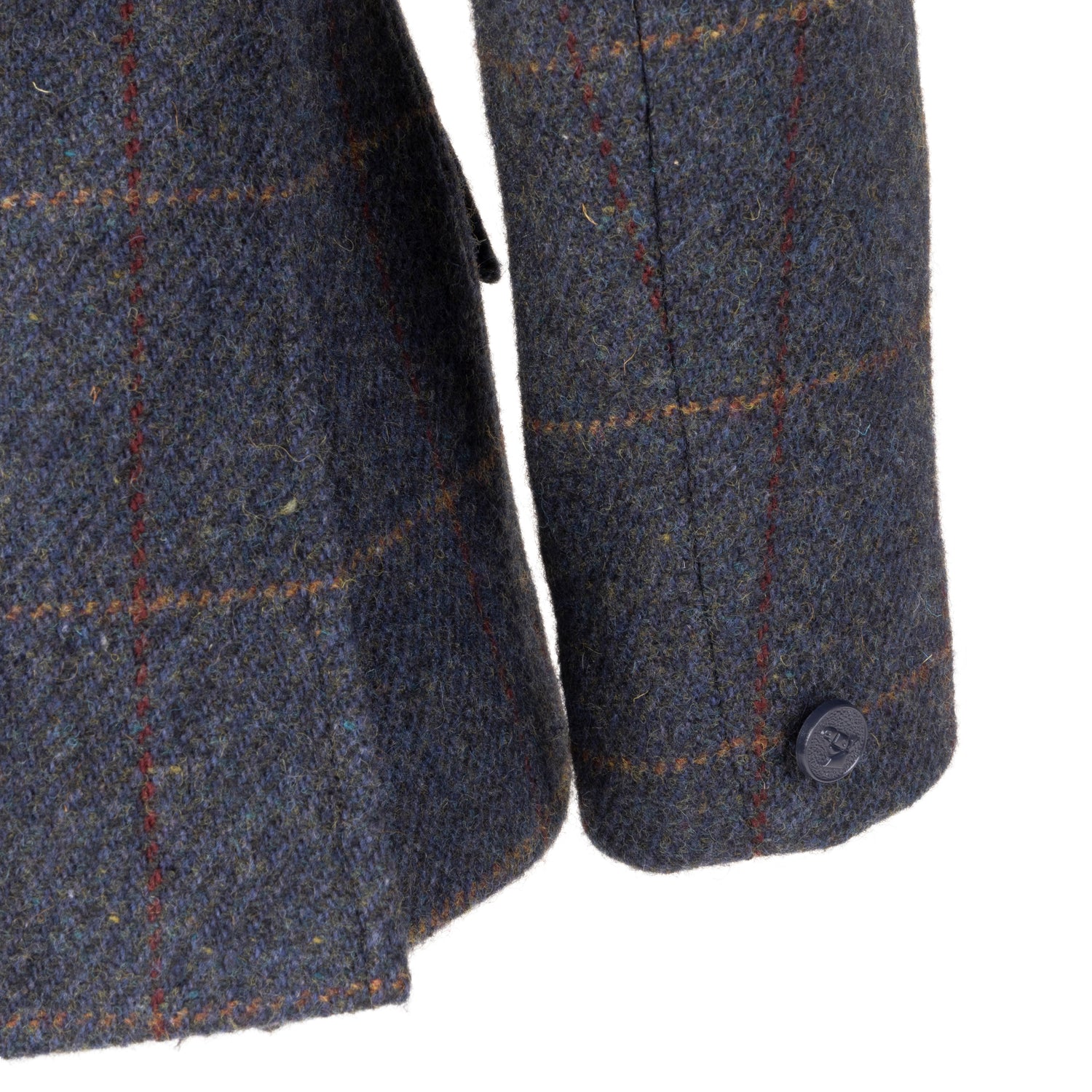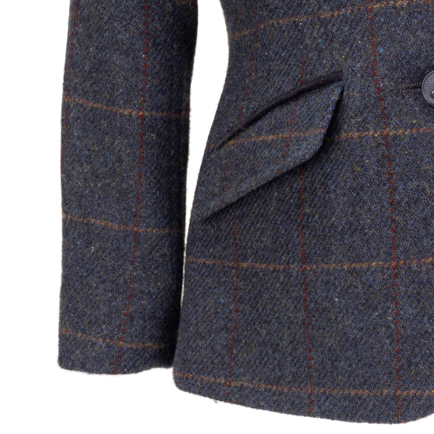A traditional classic show jacket with a fresh, modern fit in wool mix tweed checks. Style detail: tailored to flatter, velvet trim collar and pockets, double rear vents, horse button details, two flap pockets, pheasant print lining, Aubrion brand. Double fastening for boys or girls.