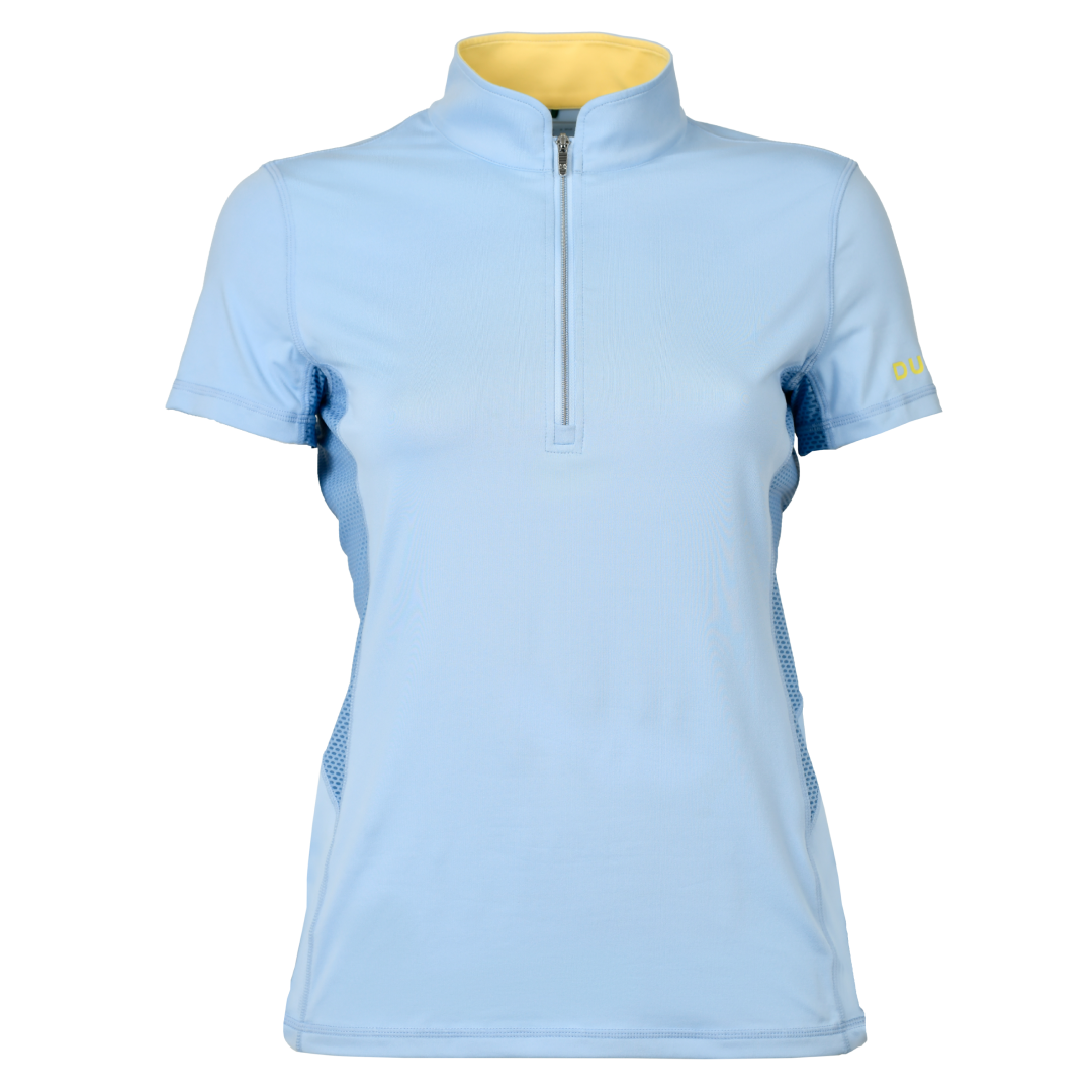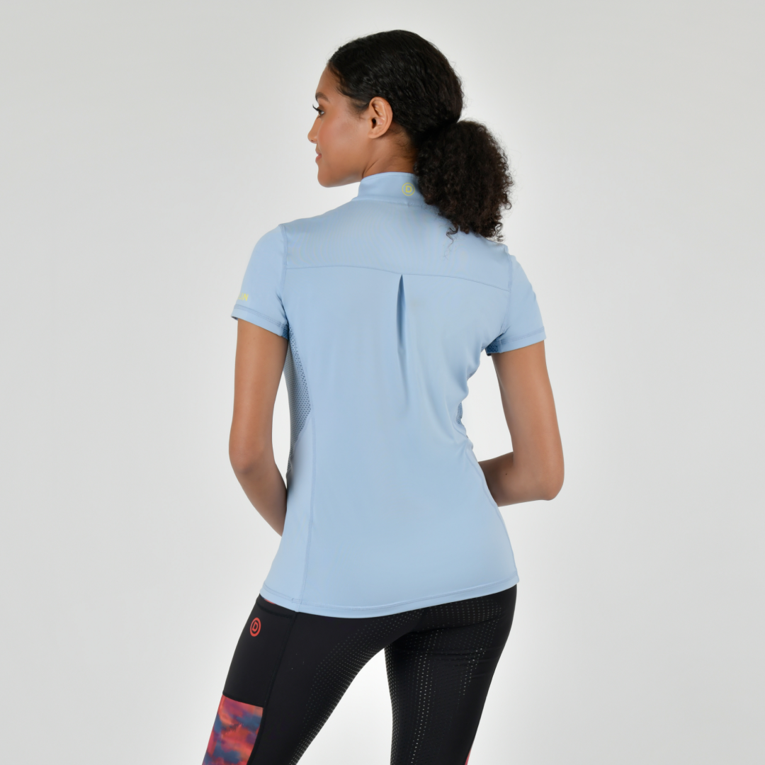 Featuring Comfort Dry Technology that will perform for you no matter what the weather providing moisture control for all day comfort. Mesh side panels, under sleeves and back yoke. The peached outer works to shed dirt, hay and horse hair, to keep you looking smart. A stand up collar with half zip placket, in a semi fitted style to offer a comfortable fit.