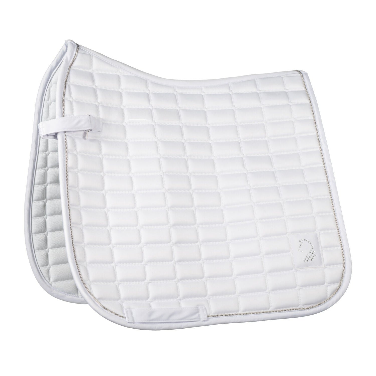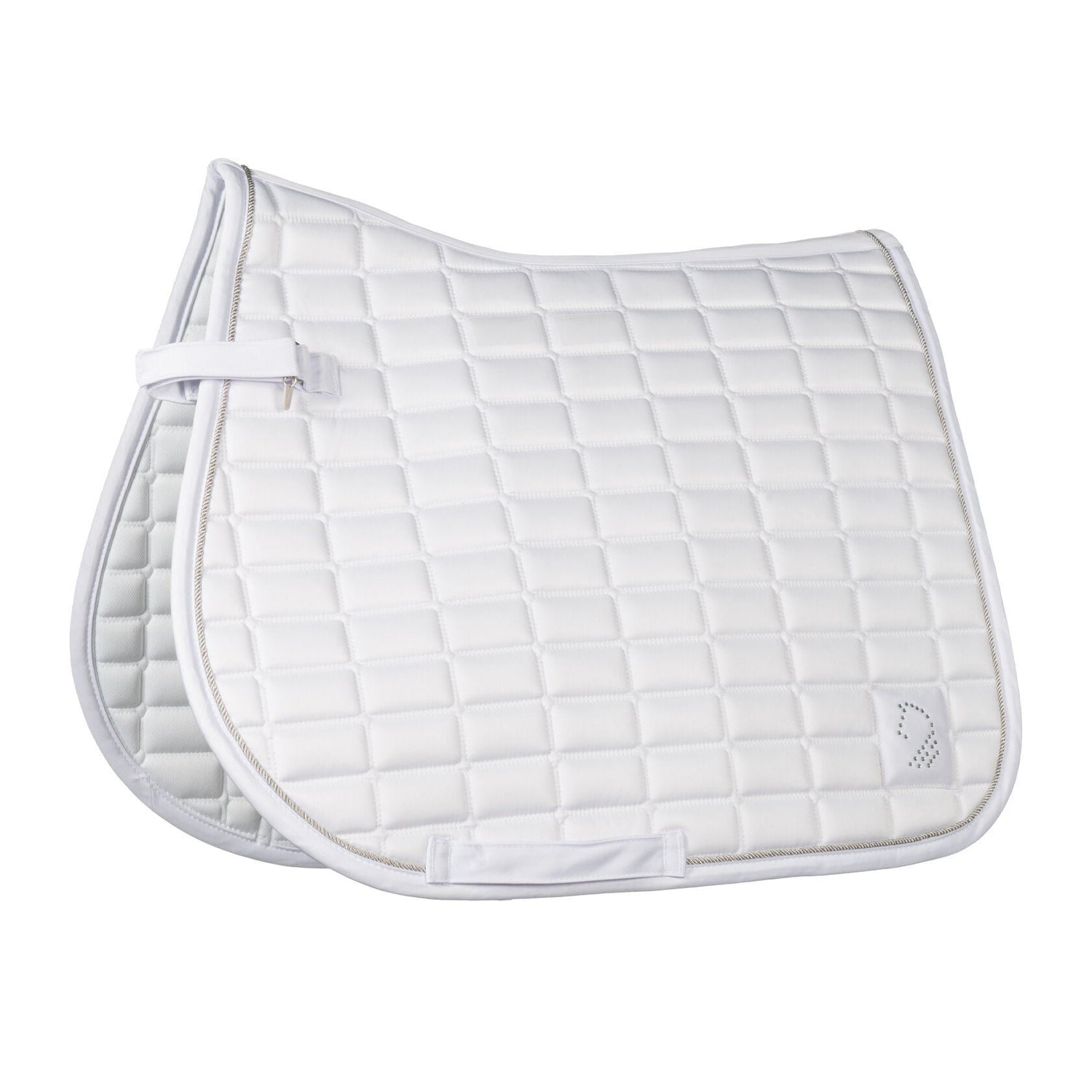 The saddle cloth Amalfi Competition by Lauria Garrelli combines functional excellence with a touch of elegance - perfect for making a grand entrance at the show. The breathable mesh underside ensures optimum moisture transport, while the non-slip silicone print guarantees a secure fit in the saddle. Removable loops allow for flexible fastening. Fine rhinestones and an elegant, silver-coloured cord on the edge give the saddle cloth an exclusive look. With its stylish design and high-quality workmanship, it is the ideal choice for discerning riders who value performance and aesthetics.