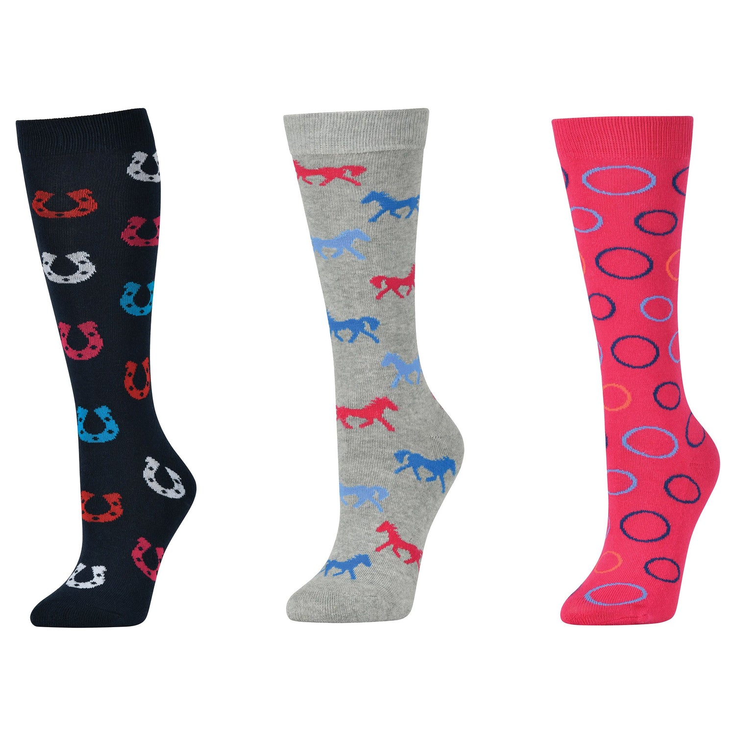 Add some fun and colour to your riding outfit with the Dublin 3 Pack Socks Childs, these packs of high socks add colour and comfort to any outfit, made from a naturally breathable stretch cotton your feet are sure to stay comfortable all day long. A pack of 3 pairs of socks that come in assorted designs.