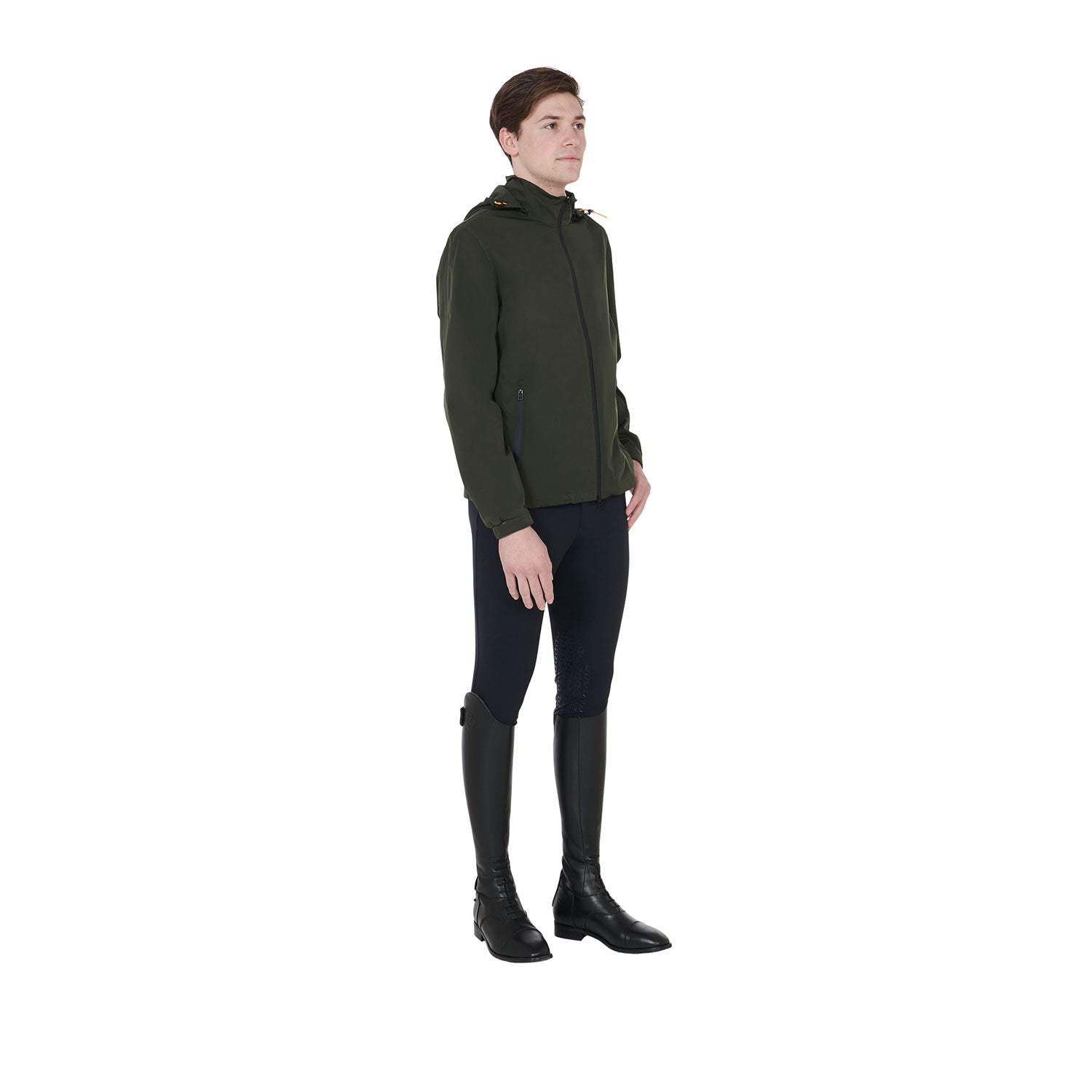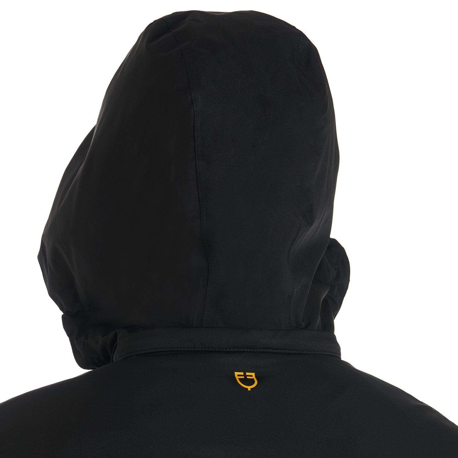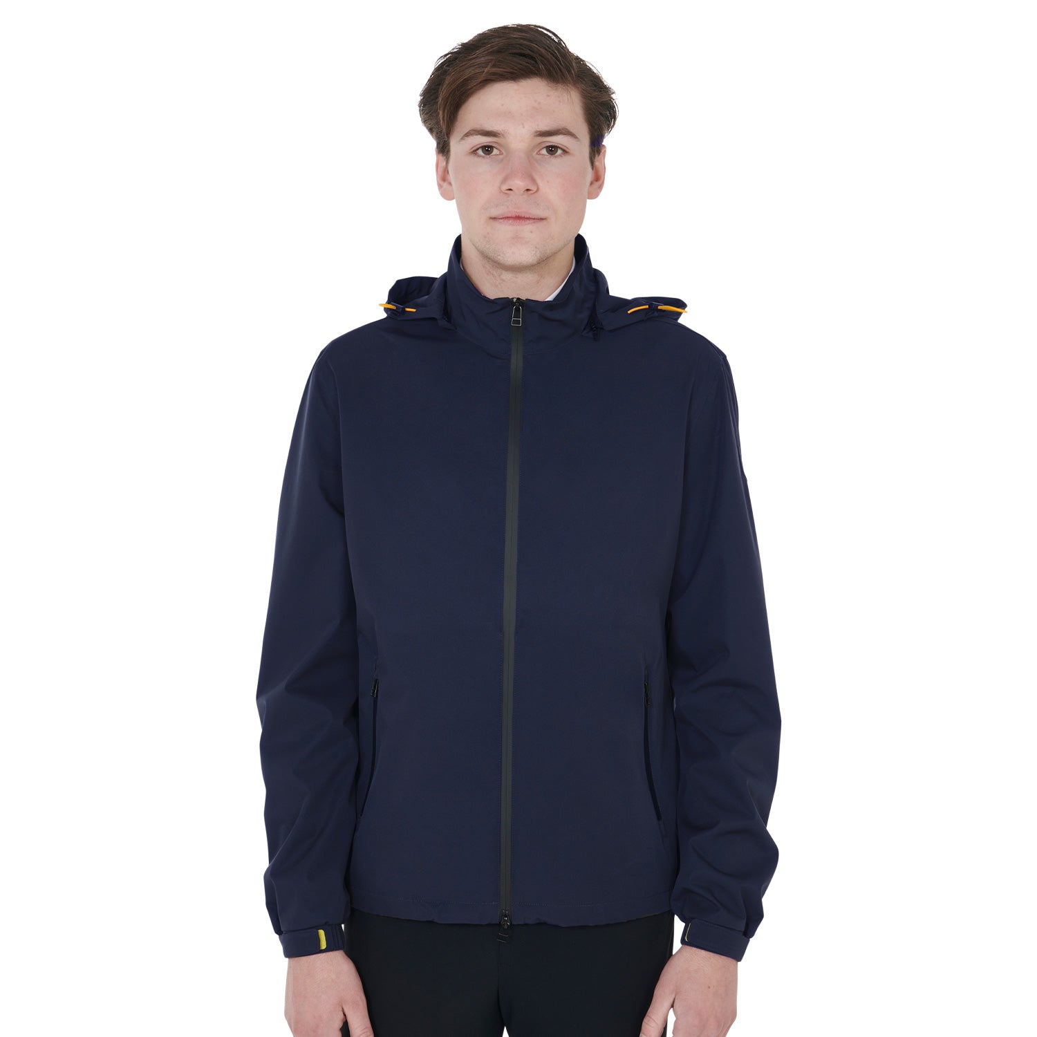 The Equestro Men's Three-Layer Technical Raincoat offers superior protection with its water-repellent, breathable membrane and fully thermo-laminated seams and zips. Designed for maximum comfort and freedom of movement, it features an adjustable hood with removable visor, double slider zip, and customizable waist and wrist drawstrings. Ideal for training or racing in wet, windy conditions, this raincoat keeps you dry and comfortable no matter the weather.