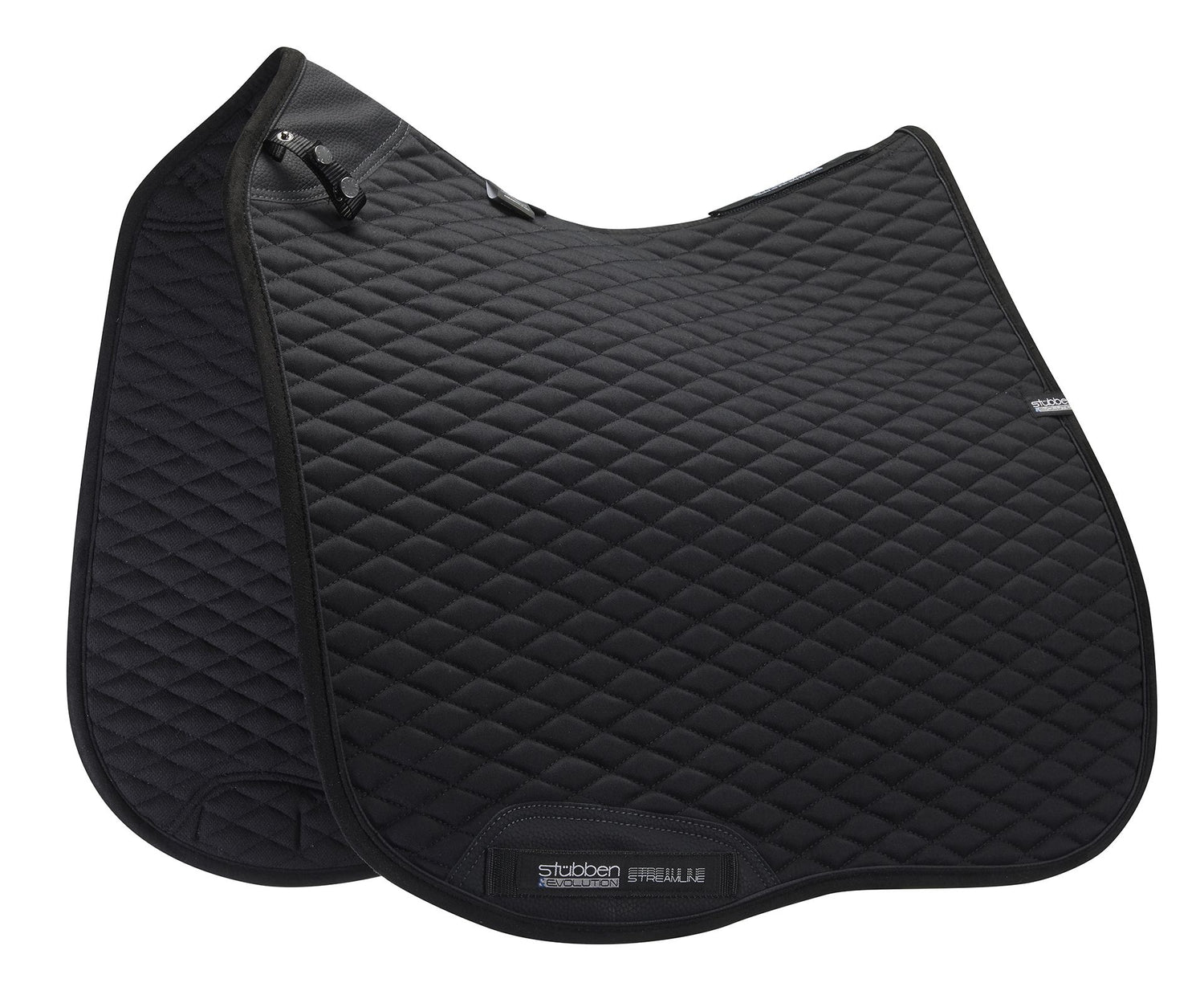 The Streamline Dressage Saddle Pad is equipped with a soft velour border, a fashionable piping band, reinforced girth and swirl channel zone, as well as adjustable press stud fastenings on the breastplate drop rings.