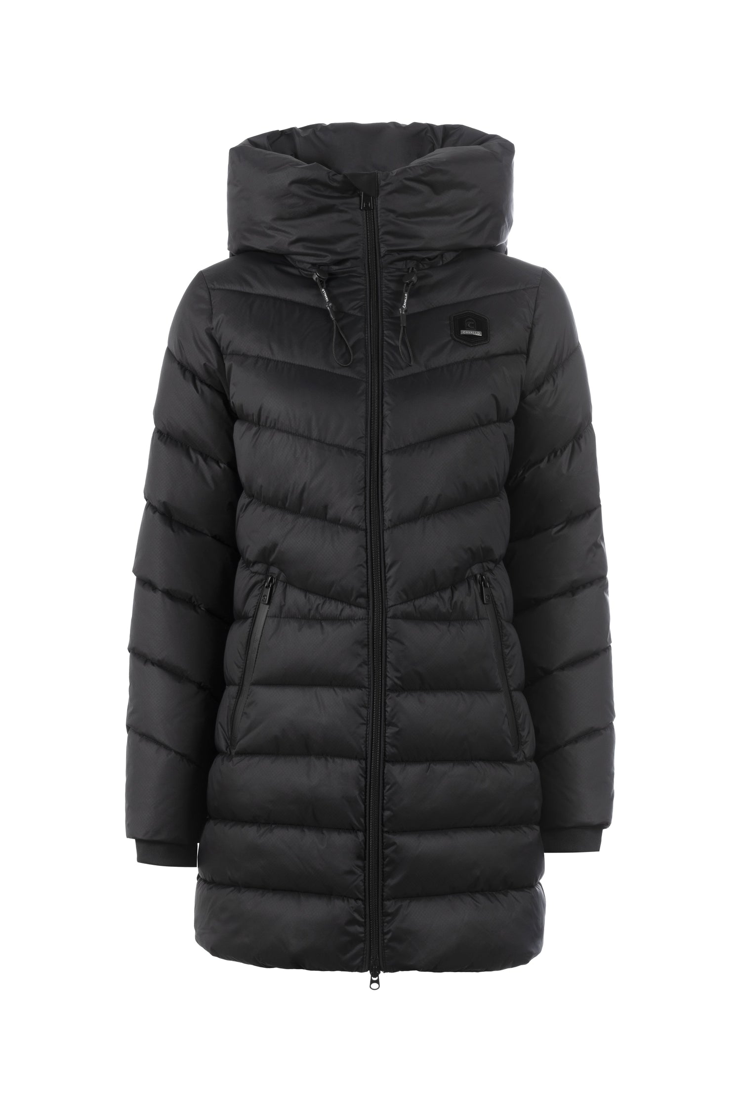 The Cavallo Maya Functional Parka features a sleek, fitted design with a large hood and high-quality label. The hood is adorned with a black drawstring and delicate white print, fastened at the back with a snap. The jacket has diagonal quilting on the upper body and horizontal quilting on the lower body, giving it a unique look.