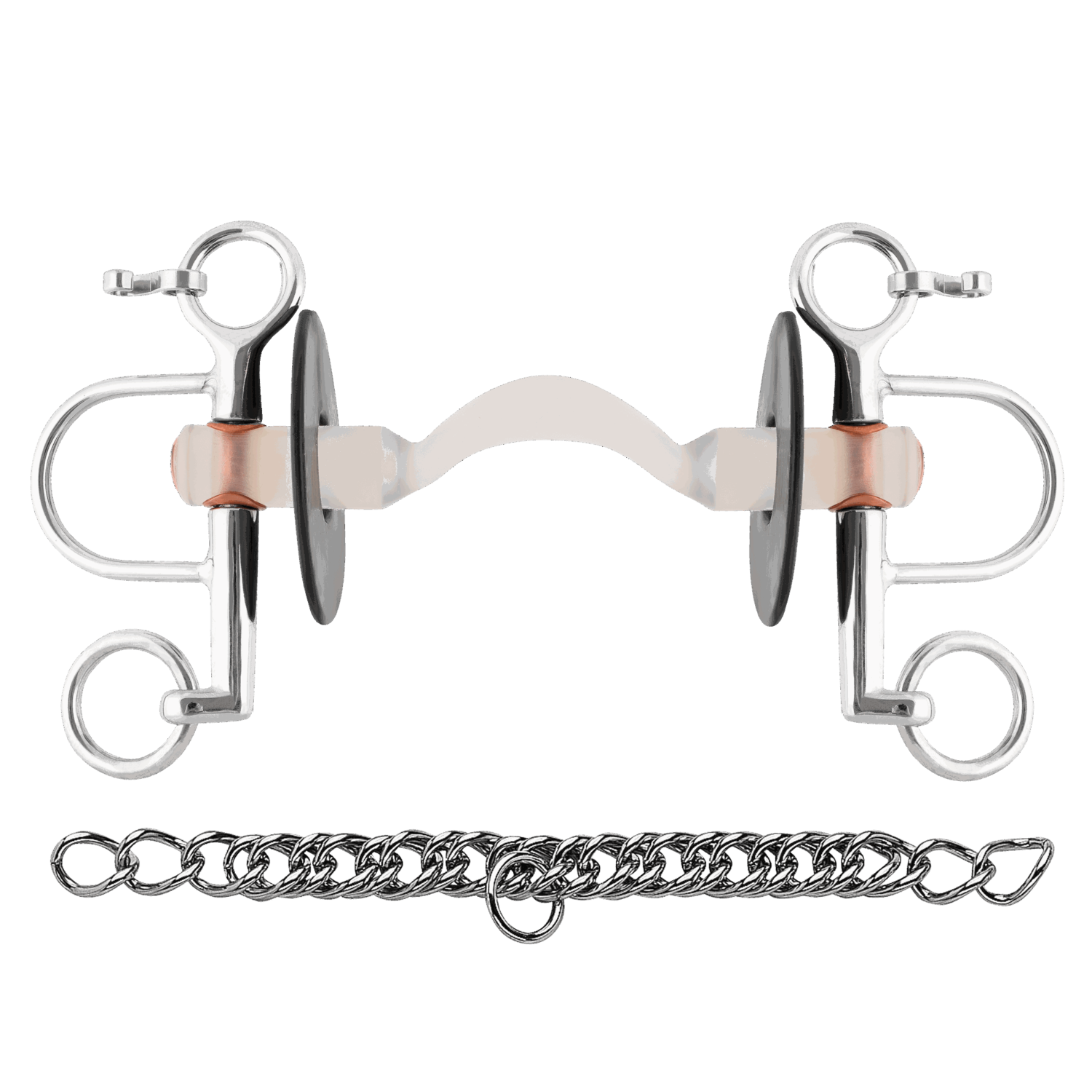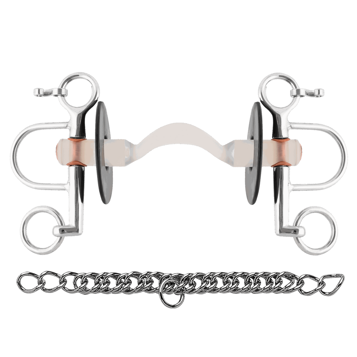 Designed to have an impact on the mouth, poll, and lower jaw, this pelham features short cheeks with a curb chain that limits leverage. It relieves the middle of the tongue and is particularly mouth-friendly, making it suitable for strong horses.