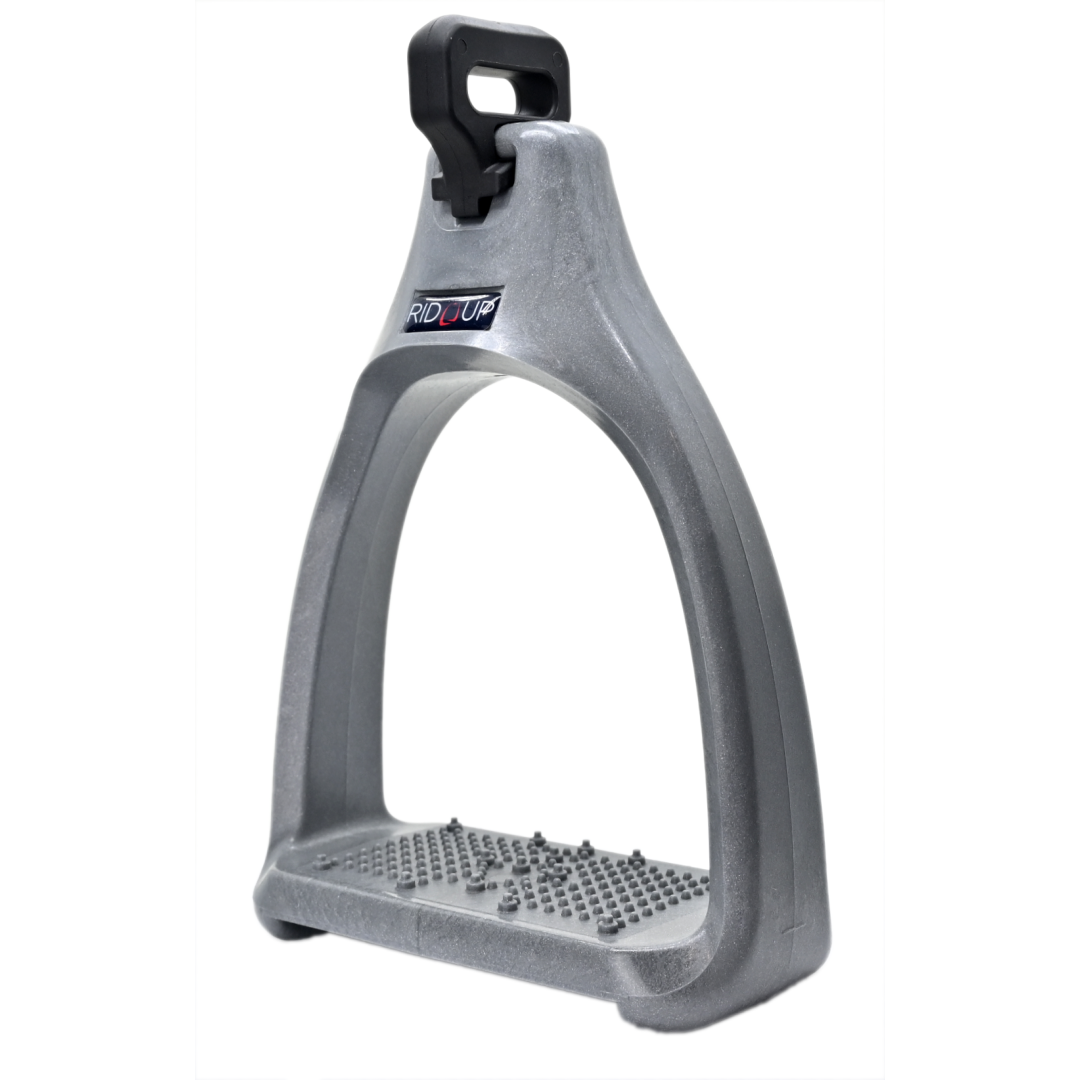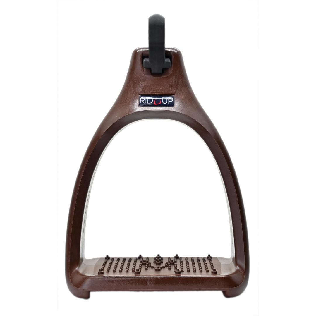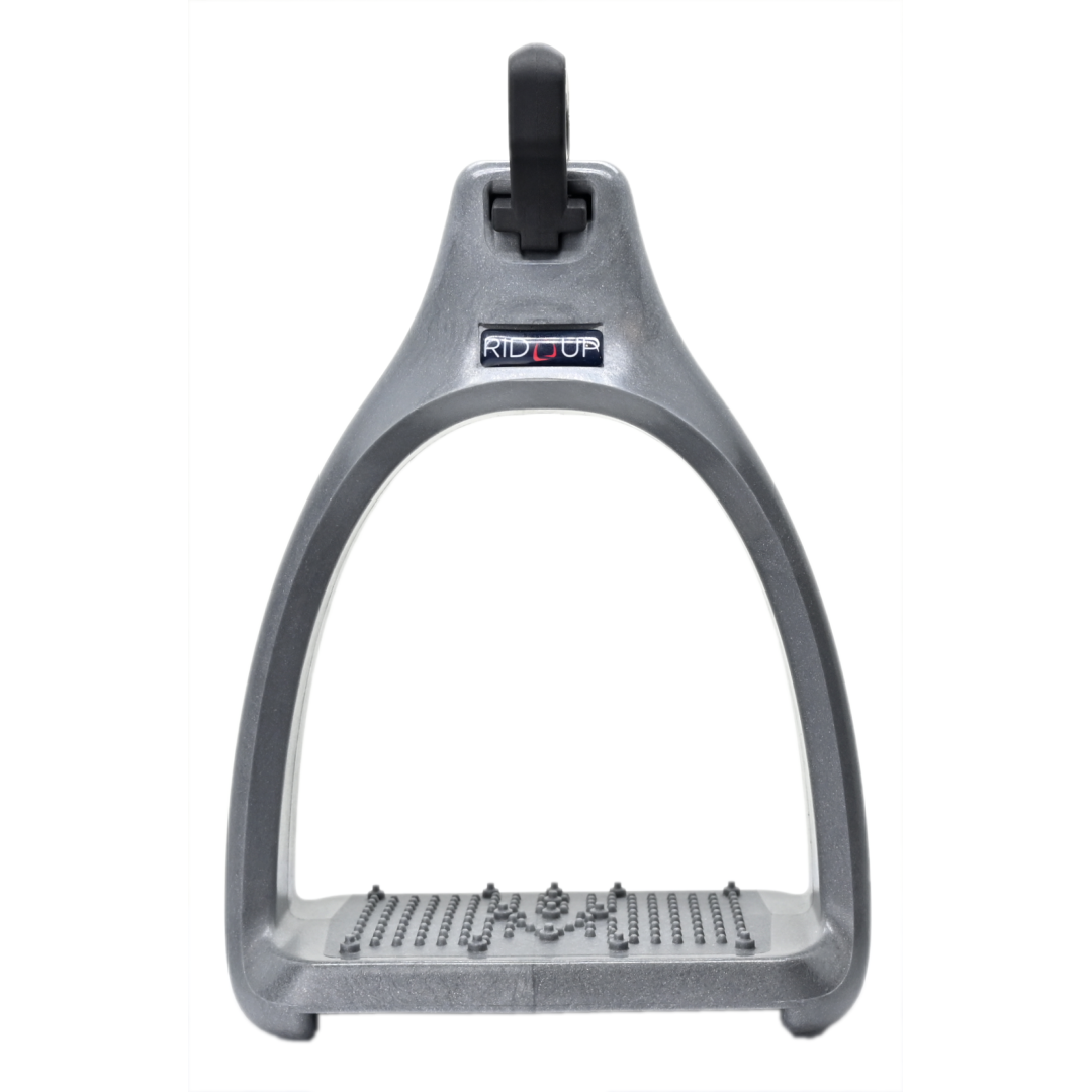 L'œil perpendiculaire au niveau de l'étrier facilite l'enfilage du Rid'Up. L'étrivière repose à plat sur le quartier de la selle pour une sensation discrète et agréable sous le mollet. Les étriers restent perpendiculaires au cheval pour plus de confort et d'accroche.