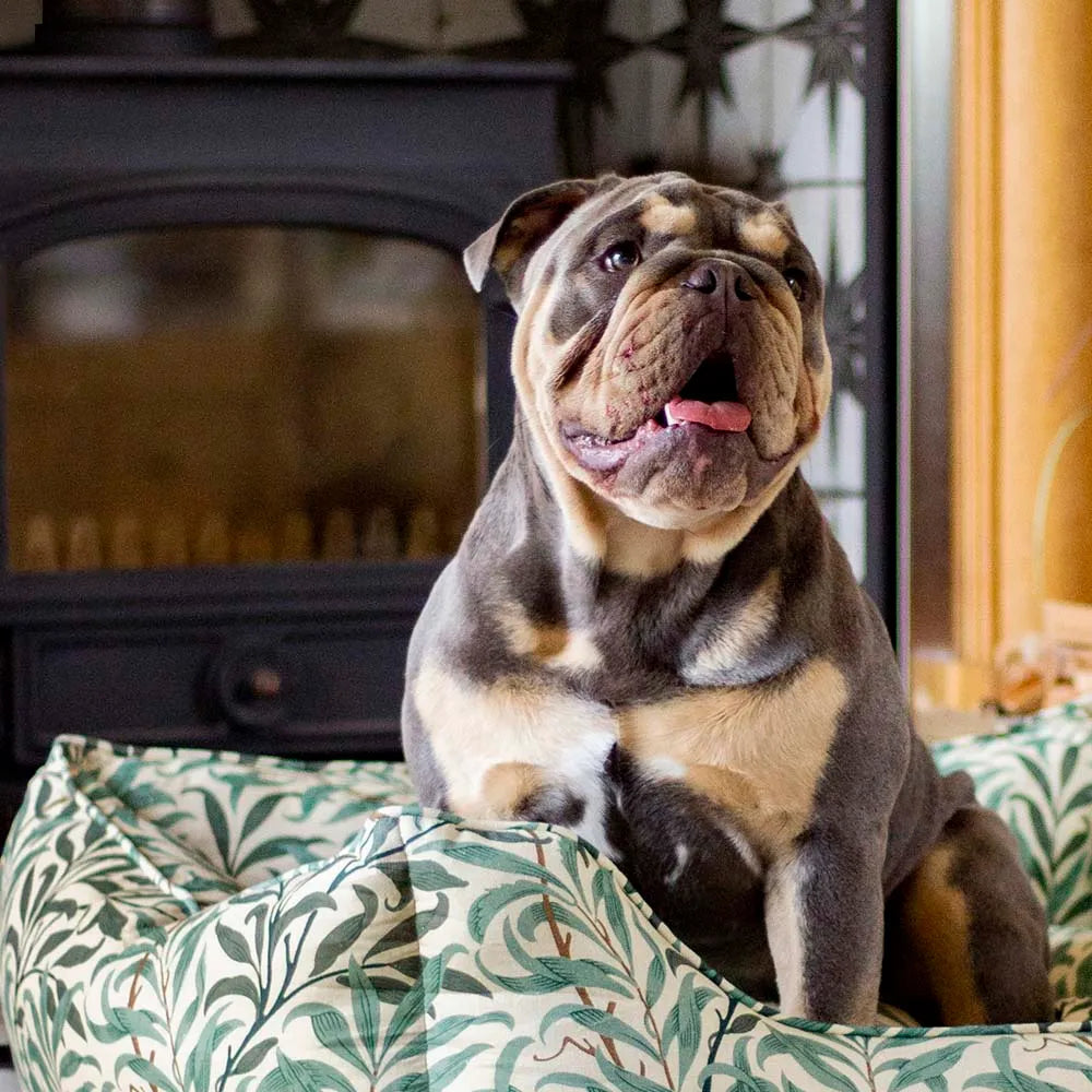 The overall pattern conveys a real sense of harmony and tranquility. Our Willow Boughs box bed features thickly padded sides for comfort and support crafted from luxurious and ultra soft linen cotton blend. The inner cushion is reversible with the luxury print on one side and dark green velvet on the other. This bed is available in 3 sizes suitable for most breeds of dogs and cats.