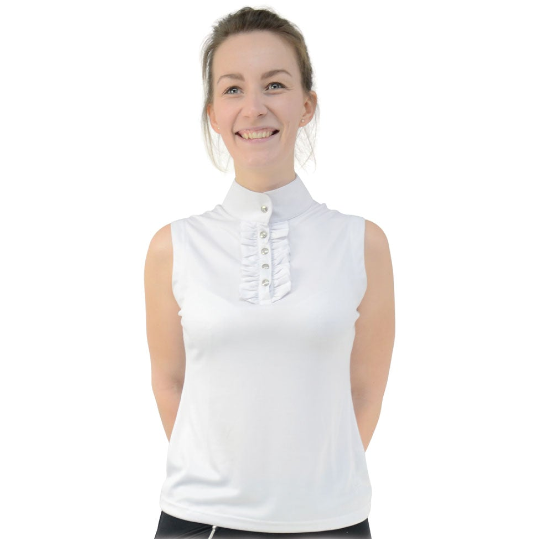 Une chemise de concours sans manches avec de superbes détails en dentelle découpée dans le dos ; une caractéristique qui peut être facilement dissimulée lorsque vous portez une veste. Fabriqué à partir d'un tissu technique confortable, respirant et bi-stretch pour plus de liberté. Conçu avec de jolis détails de volants et 5 boutons en cristal sur la patte avant. Un incontournable pour les passionnés de dressage !