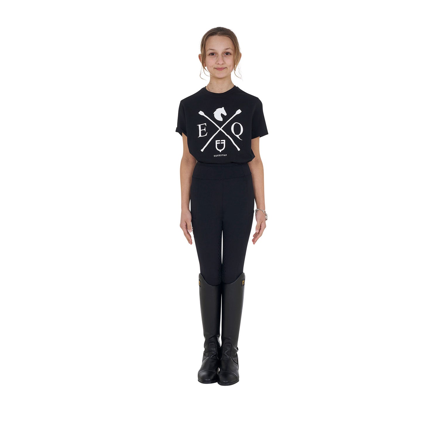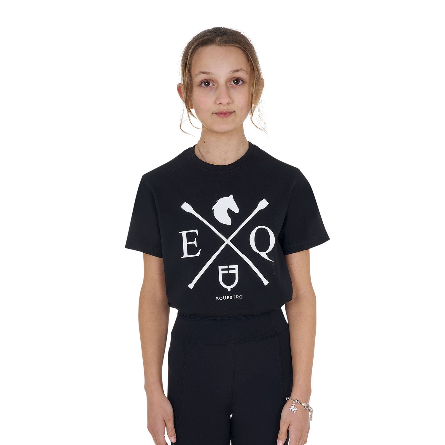 This slim fit girls' T-shirt from Equestro combines style and comfort with high-quality cotton fabric that ensures breathability and freedom of movement—ideal for horse riding. Its soft material absorbs moisture to keep her comfortable during active days. The minimalist design is enhanced by a contrasting chest print featuring the Equestro logo, adding a touch of timeless elegance to her wardrobe. Perfect for young riders who value both performance and style.