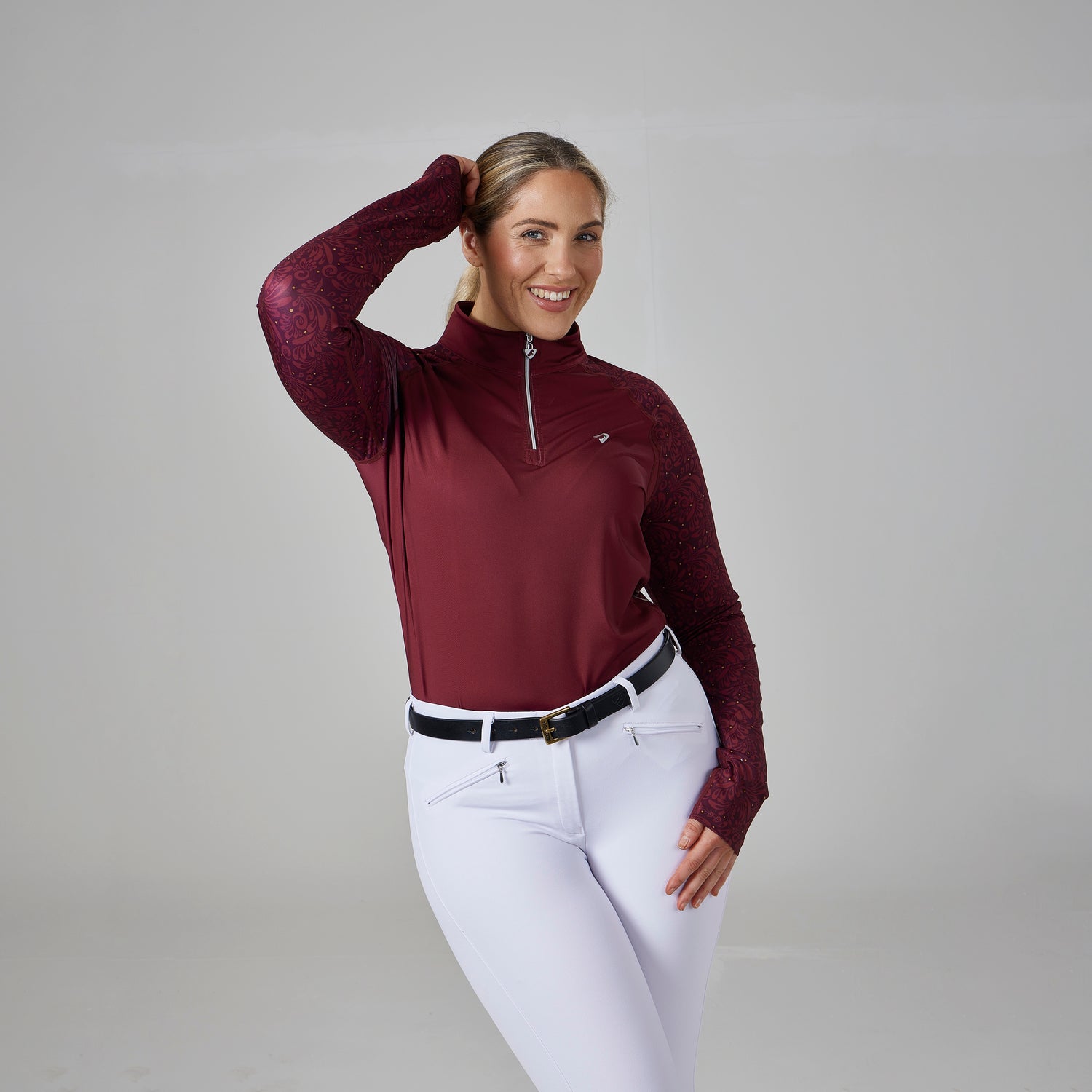 Chemise de performance conçue pour l'athlète équestre dans des designs amusants. Conçu pour se coordonner avec le couvre-chapeau et la culotte Hyde Park. Le détail style : tissu stretch à séchage rapide, col zippé ¼, coutures plates, imprimés décoratifs, branding Aubrion.