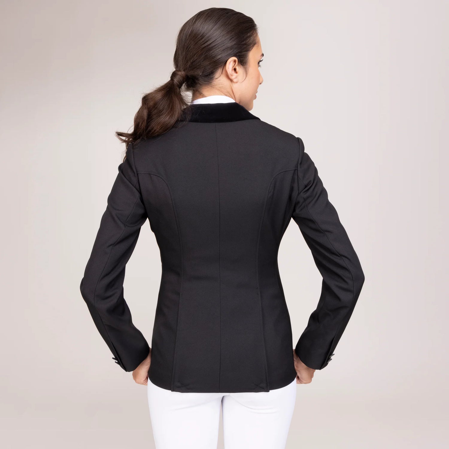 Cette veste de concours de forme classique présente une coupe élégante avec un col bordé de velours, des doubles fentes arrière et des fermetures à boutons et des manches de couleur laiton. Étant lavable à la main, cette veste est très facile à entretenir.