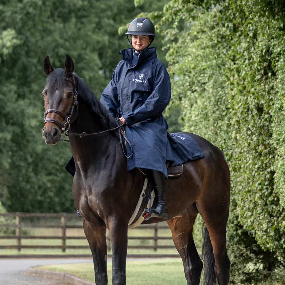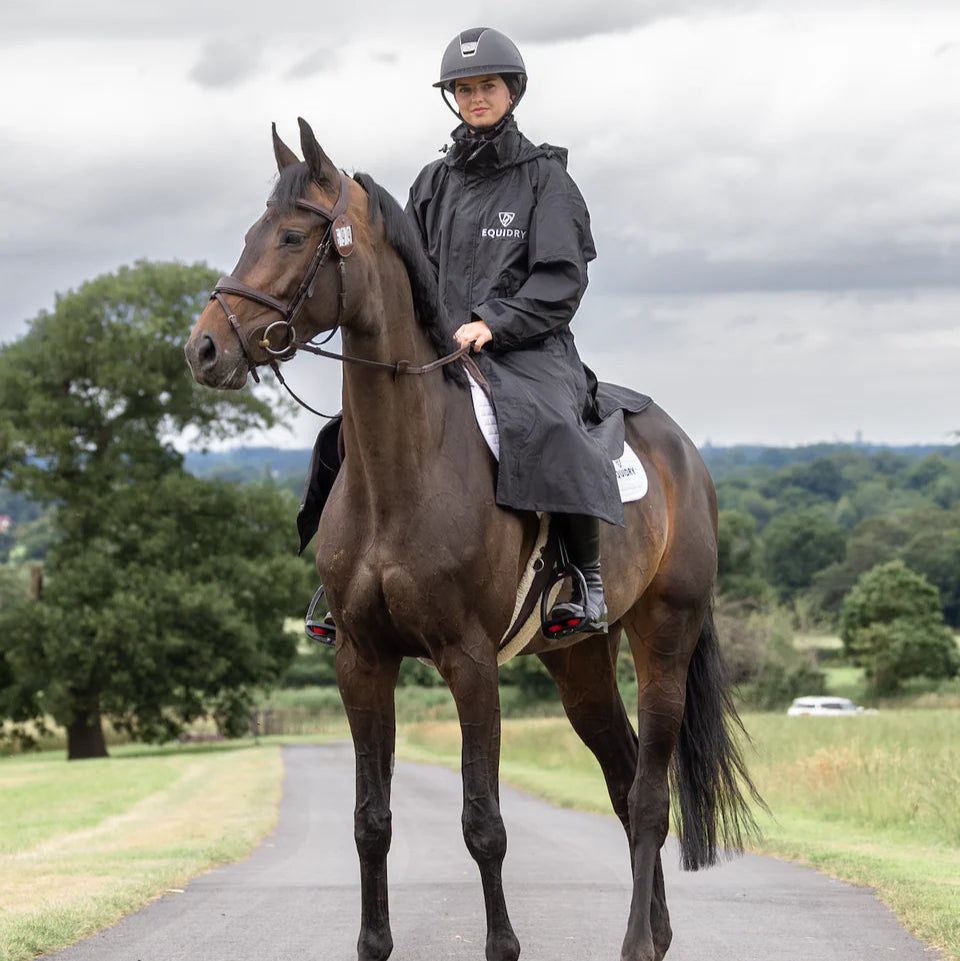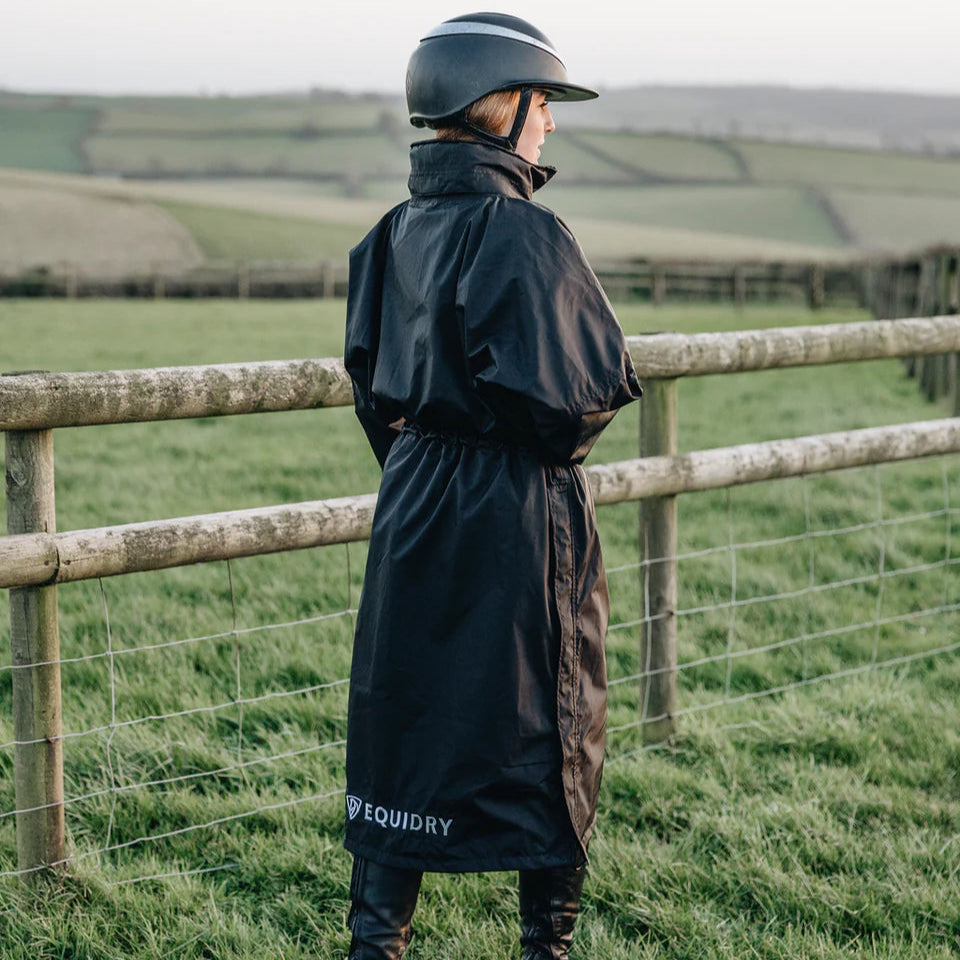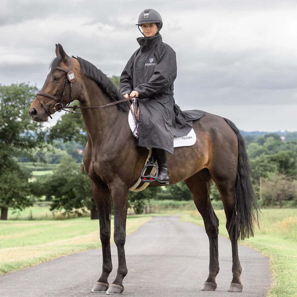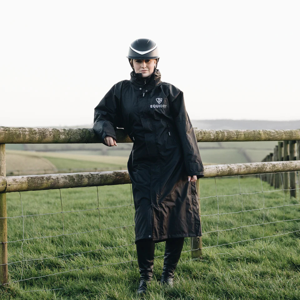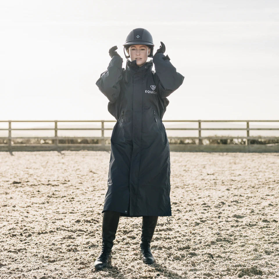 Stay dry, warm, and ready for anything in the EQUIDRY Evolution. Designed to be oversized and worn full length, this performance coat boasts a remarkable 20,000mm waterproof rating, is fully breathable, mesh-lined, and layer-friendly — even fitting over a body protector. Features include riding side zips that hold the coat securely in place and reveal hidden storm skirts that flare out in the saddle for enhanced leg coverage, along with adjustable cuffs, multiple pockets, and internal embroidery access.