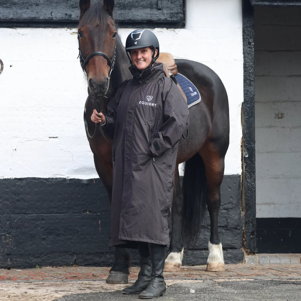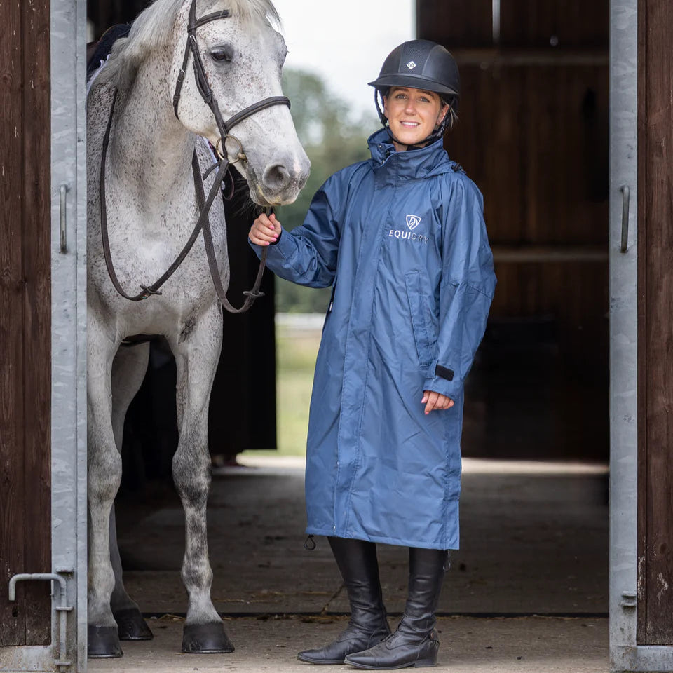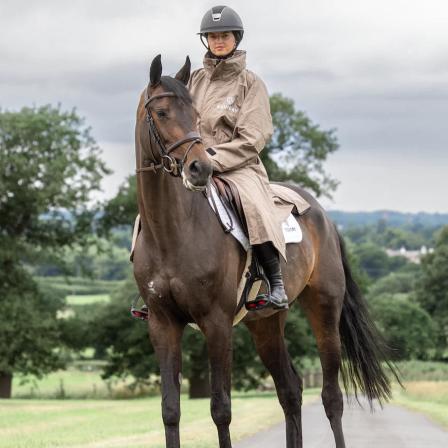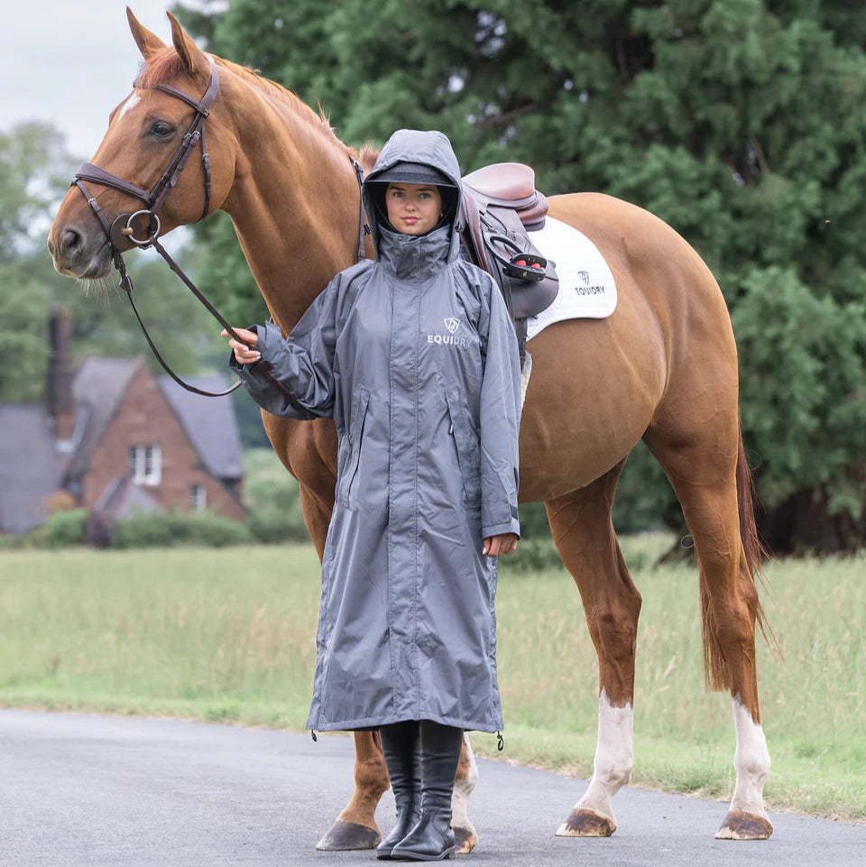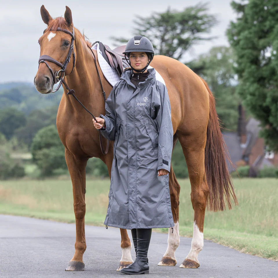 Stay dry, warm, and ready for anything in the EQUIDRY Evolution. Designed to be oversized and worn full length, this performance coat boasts a remarkable 20,000mm waterproof rating, is fully breathable, mesh-lined, and layer-friendly — even fitting over a body protector. Features include riding side zips that hold the coat securely in place and reveal hidden storm skirts that flare out in the saddle for enhanced leg coverage, along with adjustable cuffs, multiple pockets, and internal embroidery access.