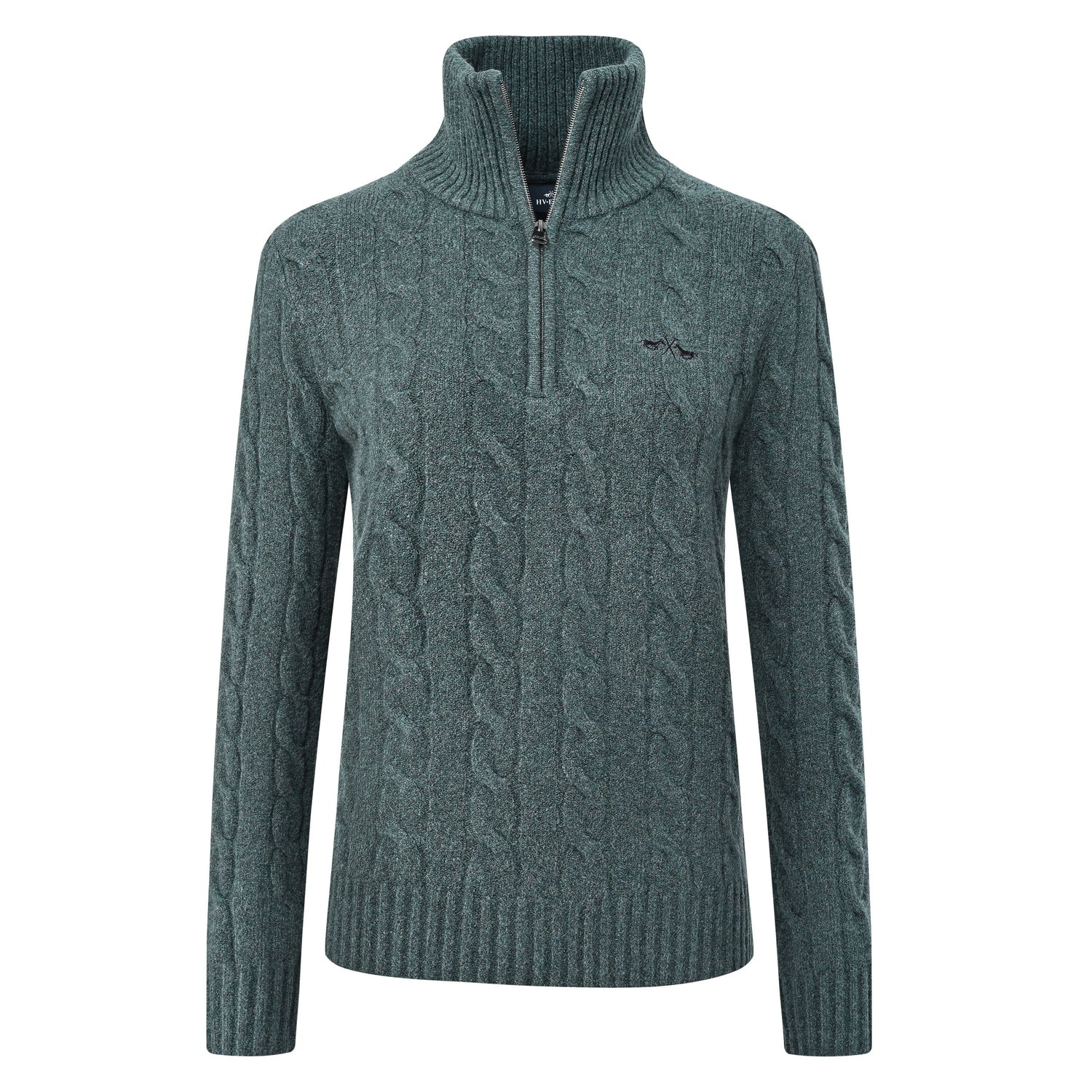 Le pull HV Polo Dunya est un luxueux pull en tricot torsadé doté d'une demi-fermeture éclair, d'un mors métallique à l'ourlet inférieur, de côtes ton sur ton aux poignets et à l'ourlet et d'un col haut avec une fermeture éclair pour une coupe ajustée. Sa poitrine présente un logo Cheval dans une séduisante broderie en lurex, et les emmanchures sont confectionnées dans un style entièrement façonné. Cette pièce unique est composée de 33% coton, 26% acrylique, 23% polyamide, 10% bambou, 5% laine et 3% élasthanne.