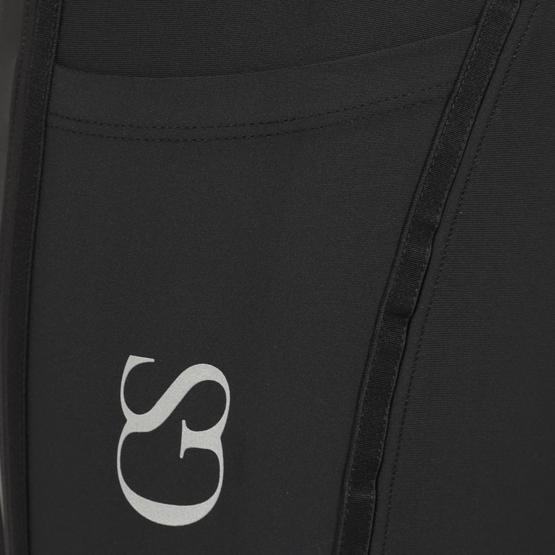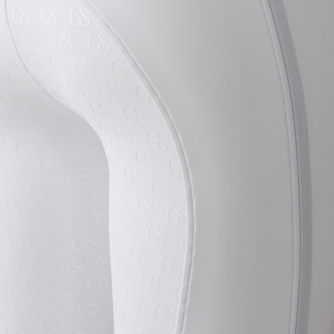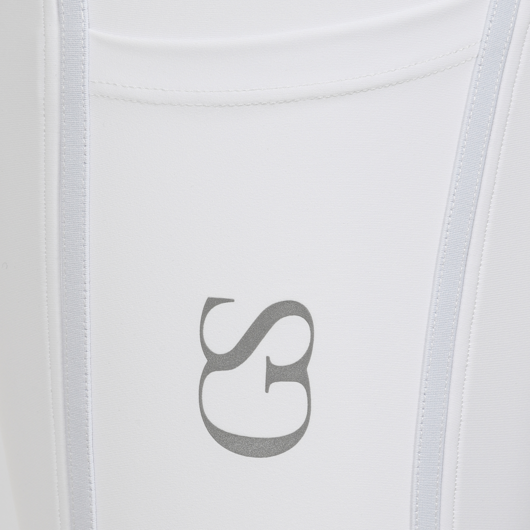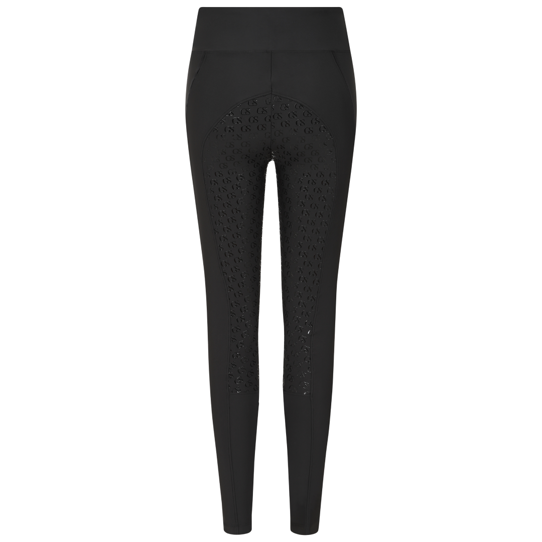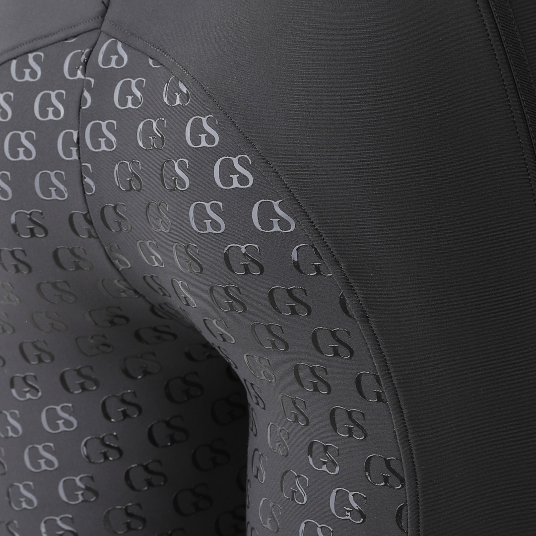 La poignée en silicone à motif « GS » est nouvelle dans la gamme GS Equestrian et offre un look élégant, tout en étant efficace. Étant un collant d'équitation à fond intégral, le silicone est coloré de la même couleur que le collant d'équitation, ce qui se fond dans le design élégant, car il recouvre une grande partie du collant d'équitation. De plus, il y a un logo GS sur la jambe gauche, situé sur la poche du téléphone, qui a une touche réfléchissante.