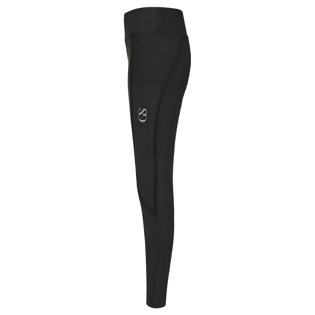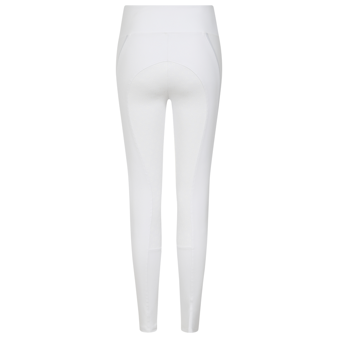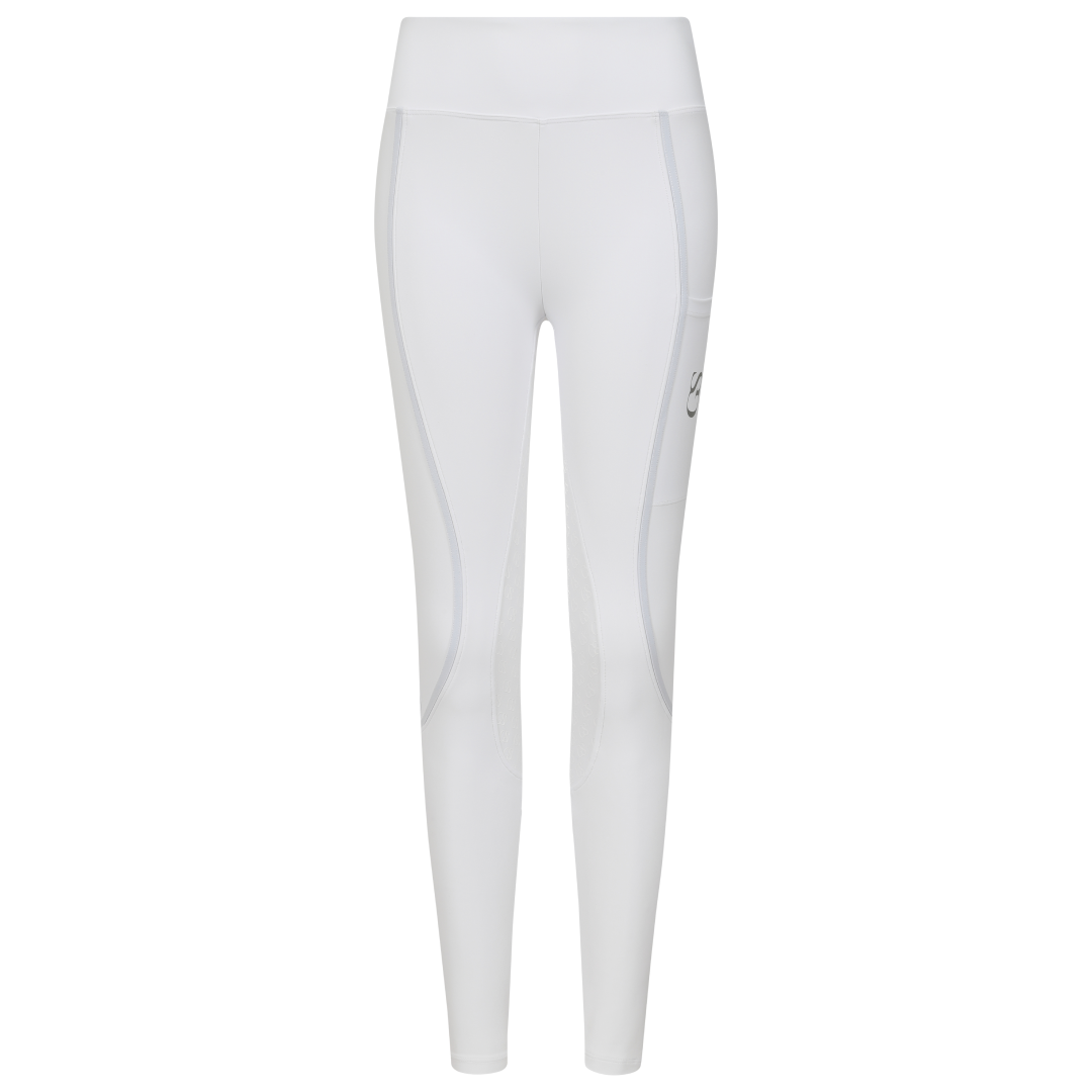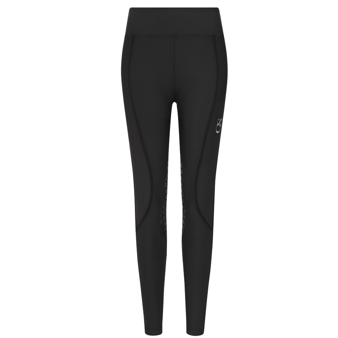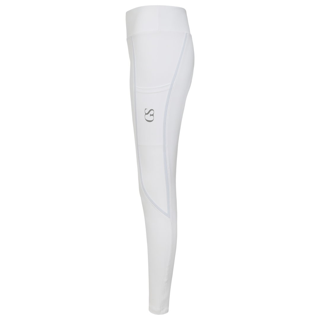 La poignée en silicone à motif « GS » est nouvelle dans la gamme GS Equestrian et offre un look élégant, tout en étant efficace. Étant un collant d'équitation à fond intégral, le silicone est coloré de la même couleur que le collant d'équitation, ce qui se fond dans le design élégant, car il recouvre une grande partie du collant d'équitation. De plus, il y a un logo GS sur la jambe gauche, situé sur la poche du téléphone, qui a une touche réfléchissante.
