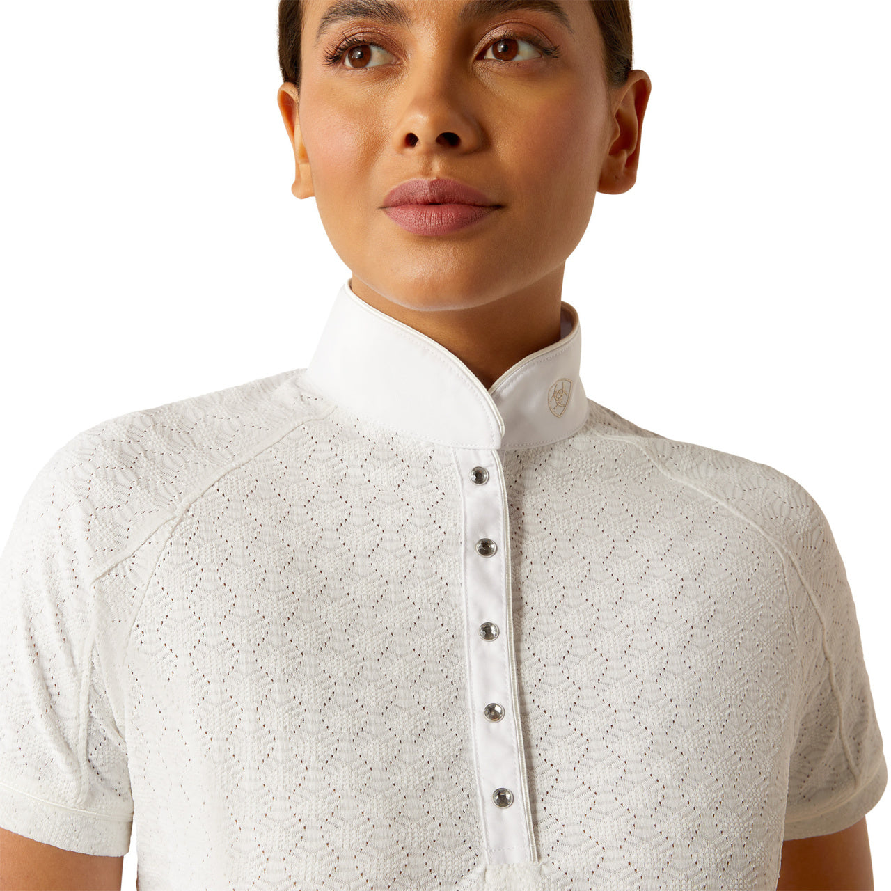 Stand out and stay cool this show season in Showstopper X. Crafted from breathable mesh fabric with just-right stretch and finished with crystal snaps and a shimmery logo, it's an elevated take on Ariat's rider-loved show shirt.