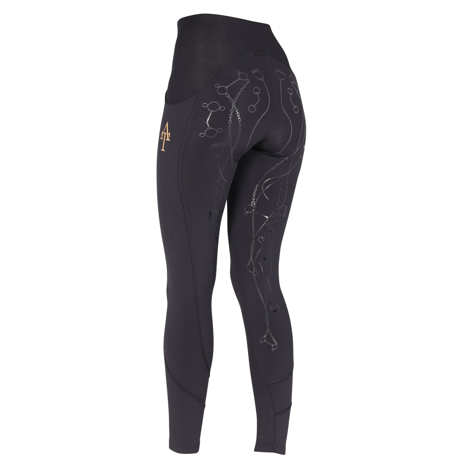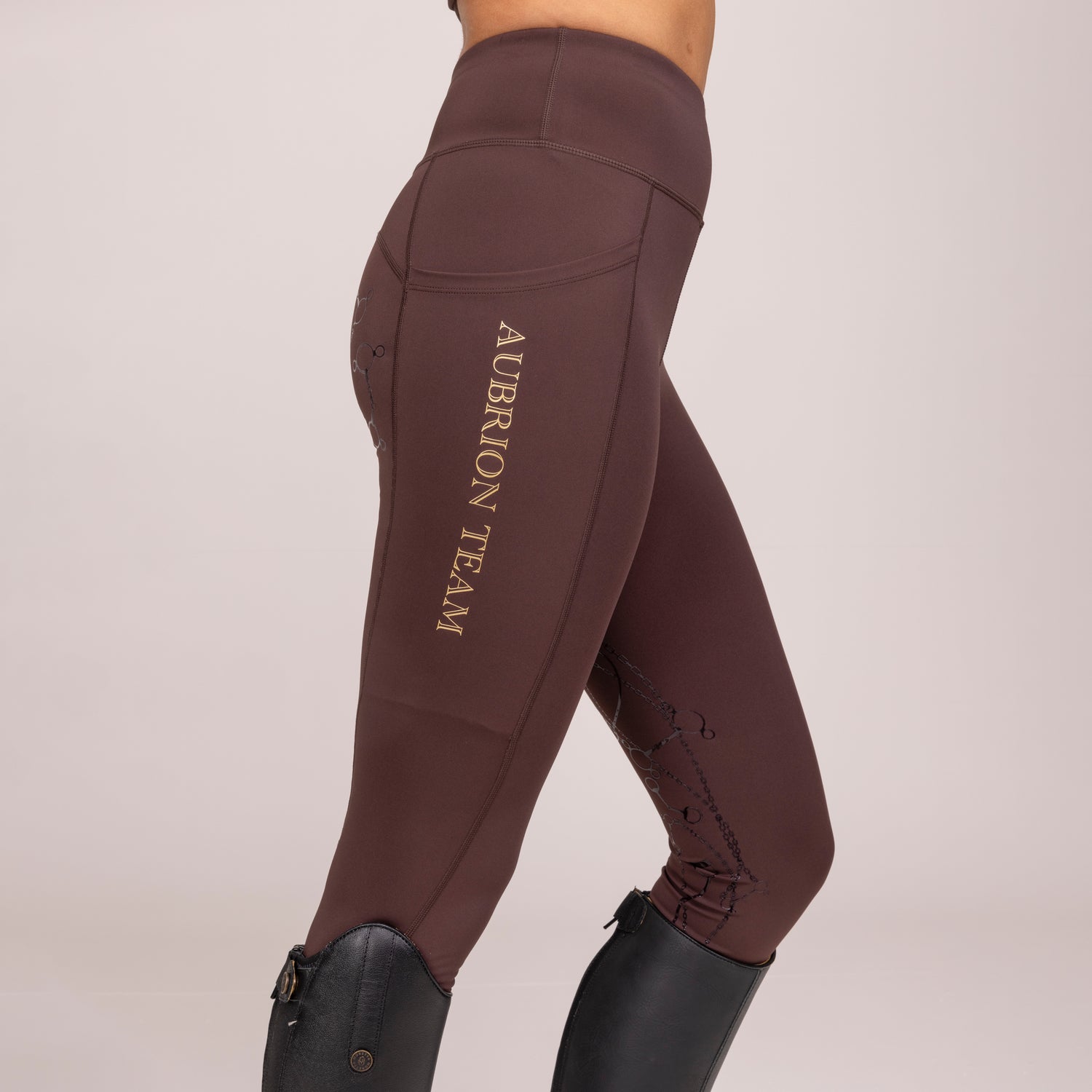 Add an elegant sleek look to your style with the Aubrion Team Riding Tights. Supportive and shaping for an elegant smoothing effect, the sleek deep waist gives a flattering contour look. The tights offer flex-fit stretch and moisture management for comfort, silicone grips add in-saddle security. To help with temperature control and for a smooth fit, the lower leg is styled with highly breathable stretch cuffs. Style detail: shapes and supports, flex-fit stretch, moisture management, high contour waist, thigh phone pocket, full silicone grips, comfort seams, ankle cuffs and Aubrion Team prints.