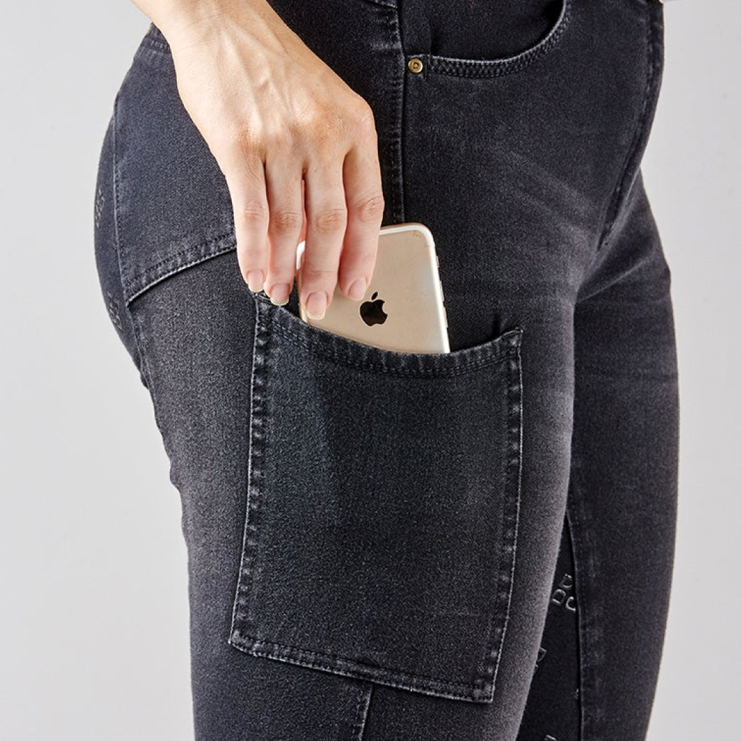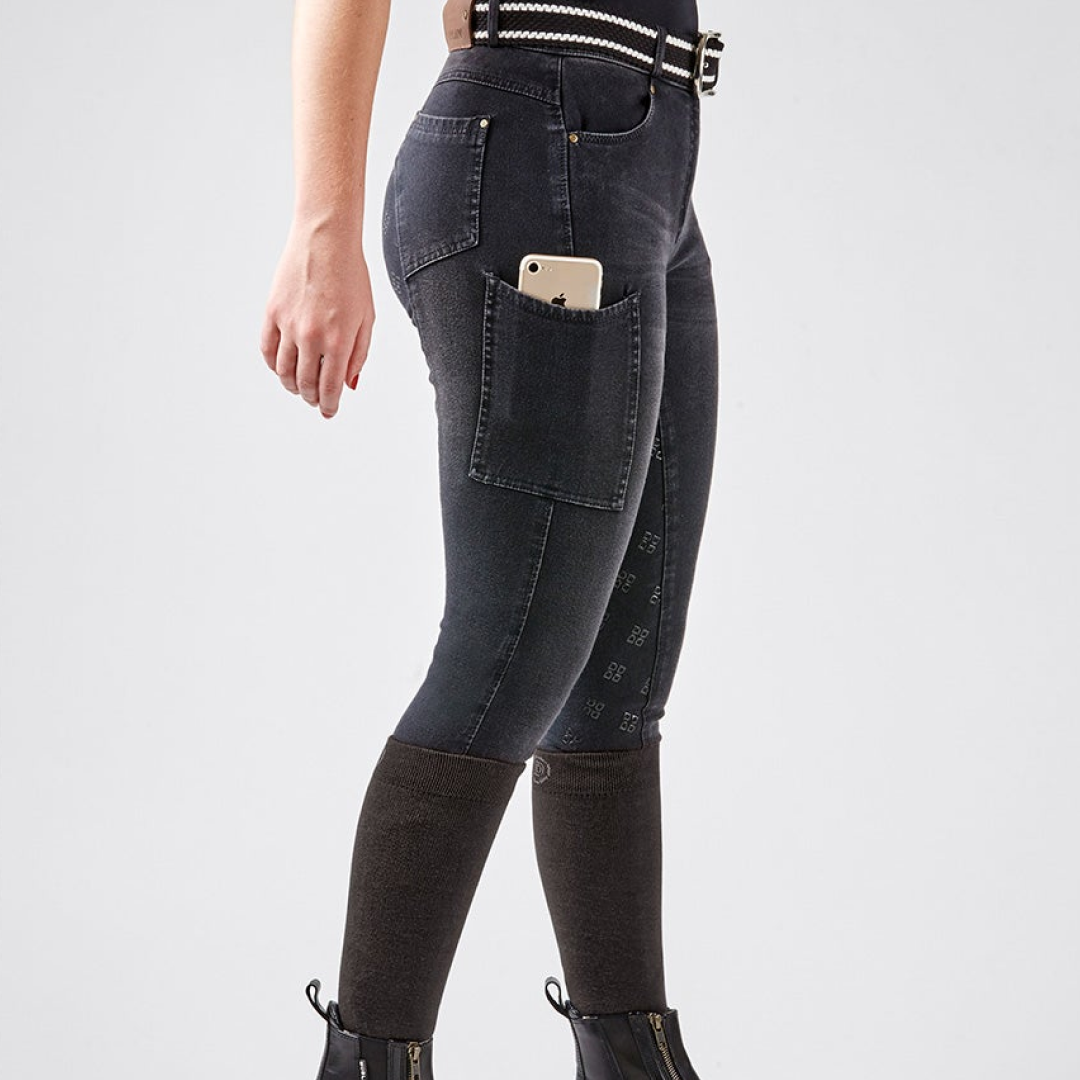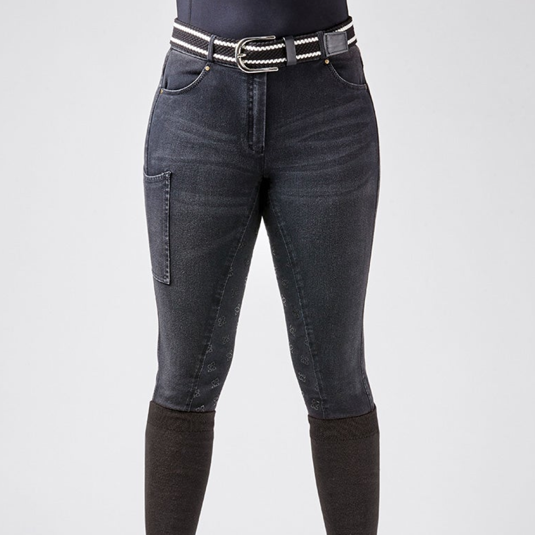 Pantalon d'équitation aspect denim délavé vintage avec fond intégral en gel de silicone (PU) fabriqué à partir d'un tissu denim bi-stretch offrant compression et couverture. Doté de 4 poches de style jean et d'une poche extérieure latérale pratique pour téléphone sur la jambe droite. Passants de ceinture en daim pour un look de conduite élégant avec fermeture éclair à bouton-pression sur le devant dans un style taille moyenne sans ceinture sans espace.