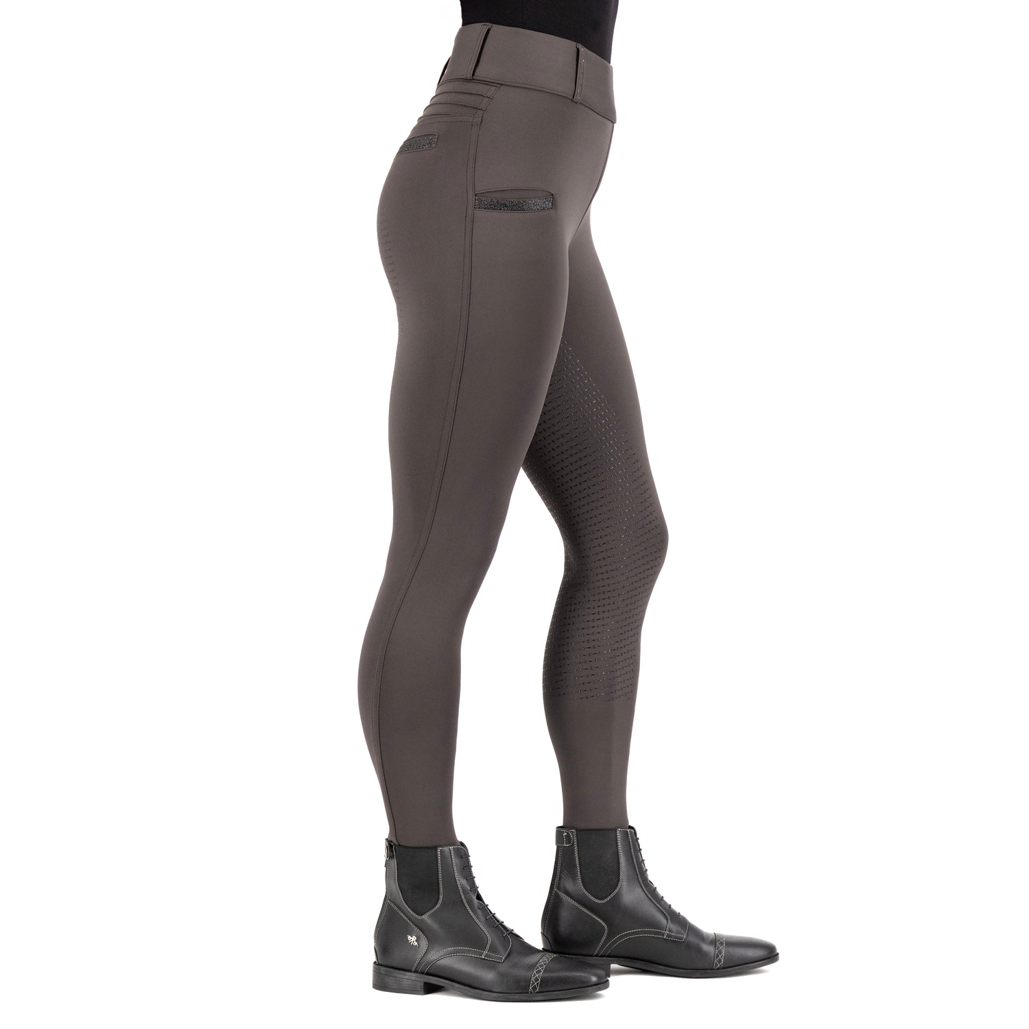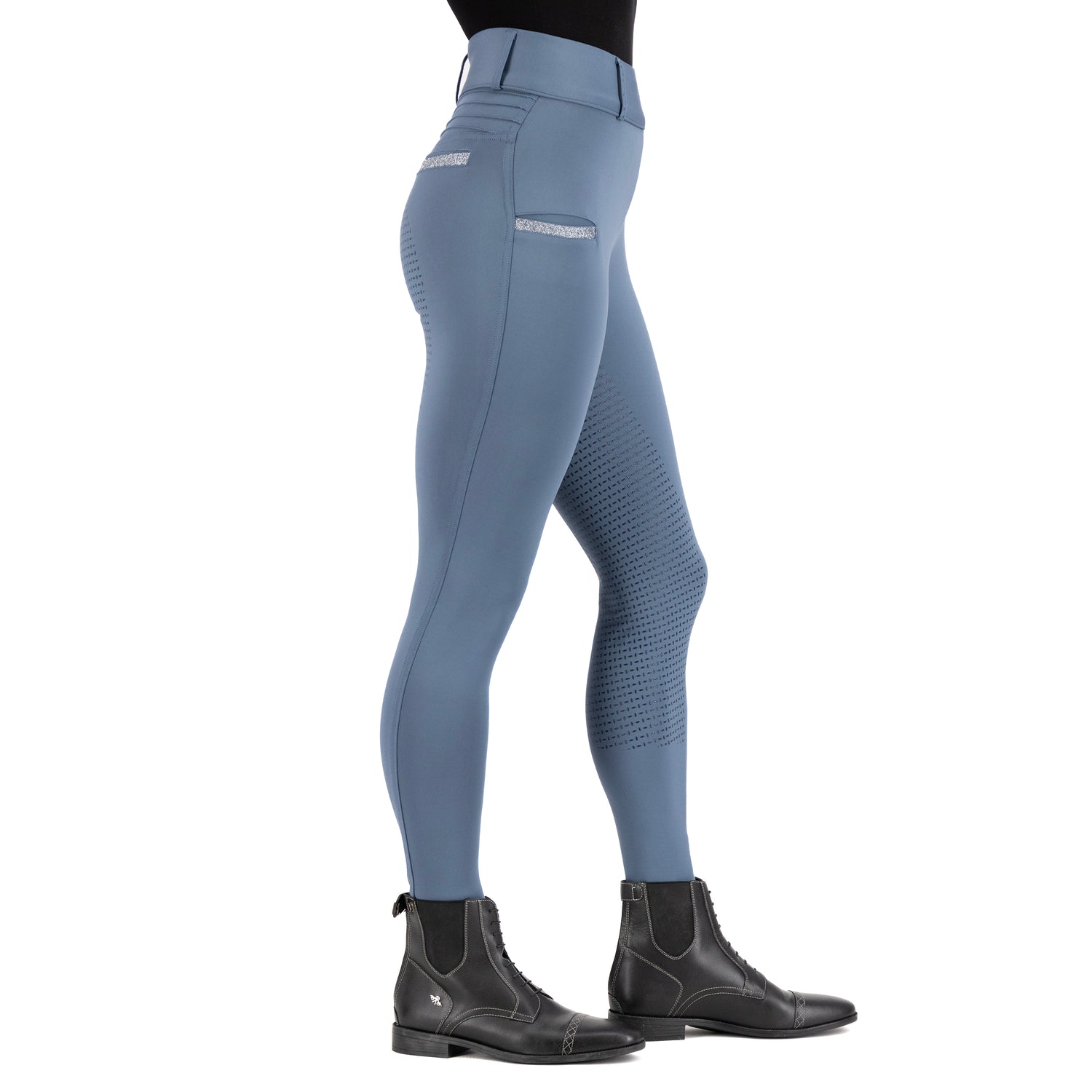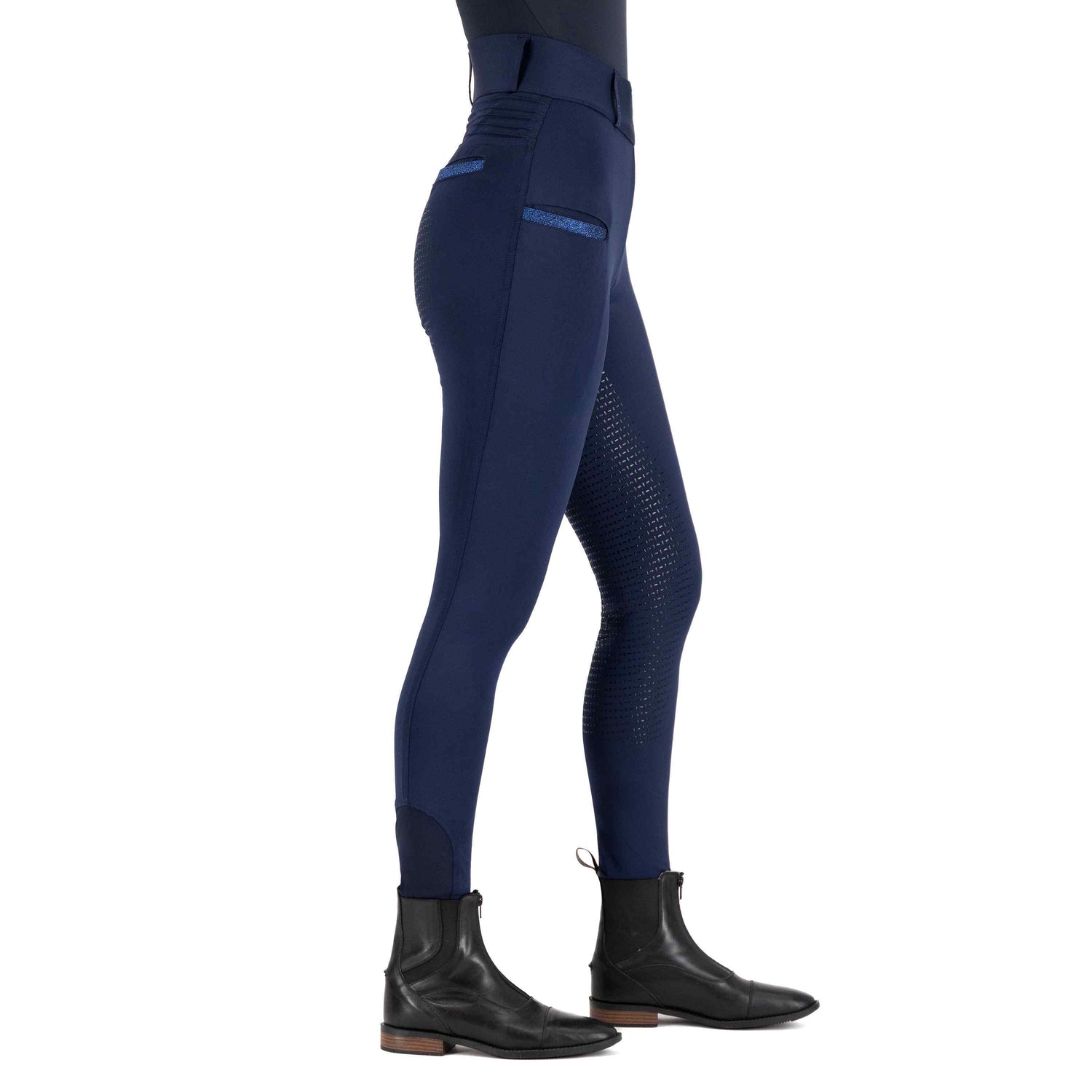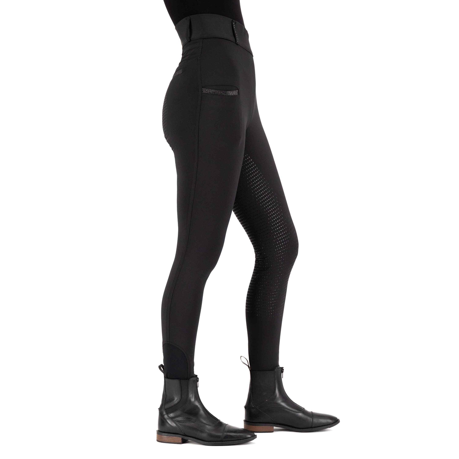 Ride in style and comfort with High Waist Riding Tights! Imperial Riding tights are made with a stretch fabric that is perfect for all your equestrian activities. The lightweight and breathable material will keep you cool and comfortable all day long. These tights feature a convenient phone pocket with glitter detail, as well as fake back pockets with glitter detail for a touch of sparkle. The rhinestone embellished belt loops add a touch of glamour to your riding ensemble. The pin tuck detail at the back yoke and logo rhinestone detail give these tights a chic and sophisticated look. The silicon fullseat provides extra grip in the saddle, while the soft and comfortable fabric ensures a comfortable fit. Get ready to turn heads in the arena with High Waist Riding Tights - the perfect blend of style and functionality for the modern equestrian.