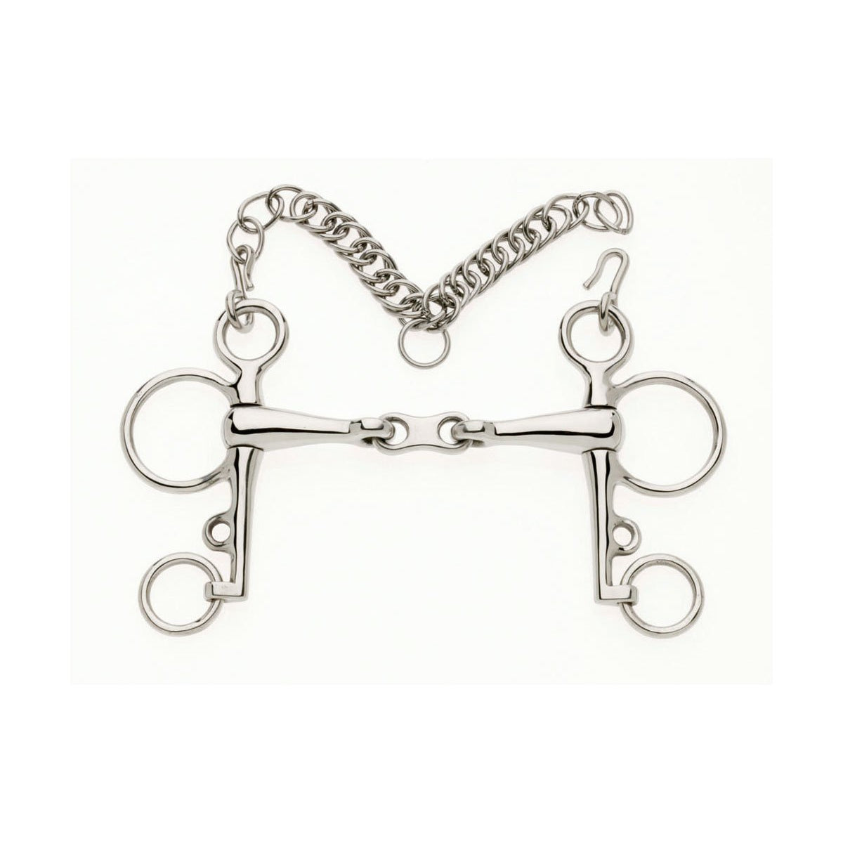 L'embout buccal French Link ravive l'action du casse-noix et évite la pression sur le palais. Idéalement utilisé avec deux rênes, mais une seule rêne peut être utilisée si des arrondis sont utilisés.