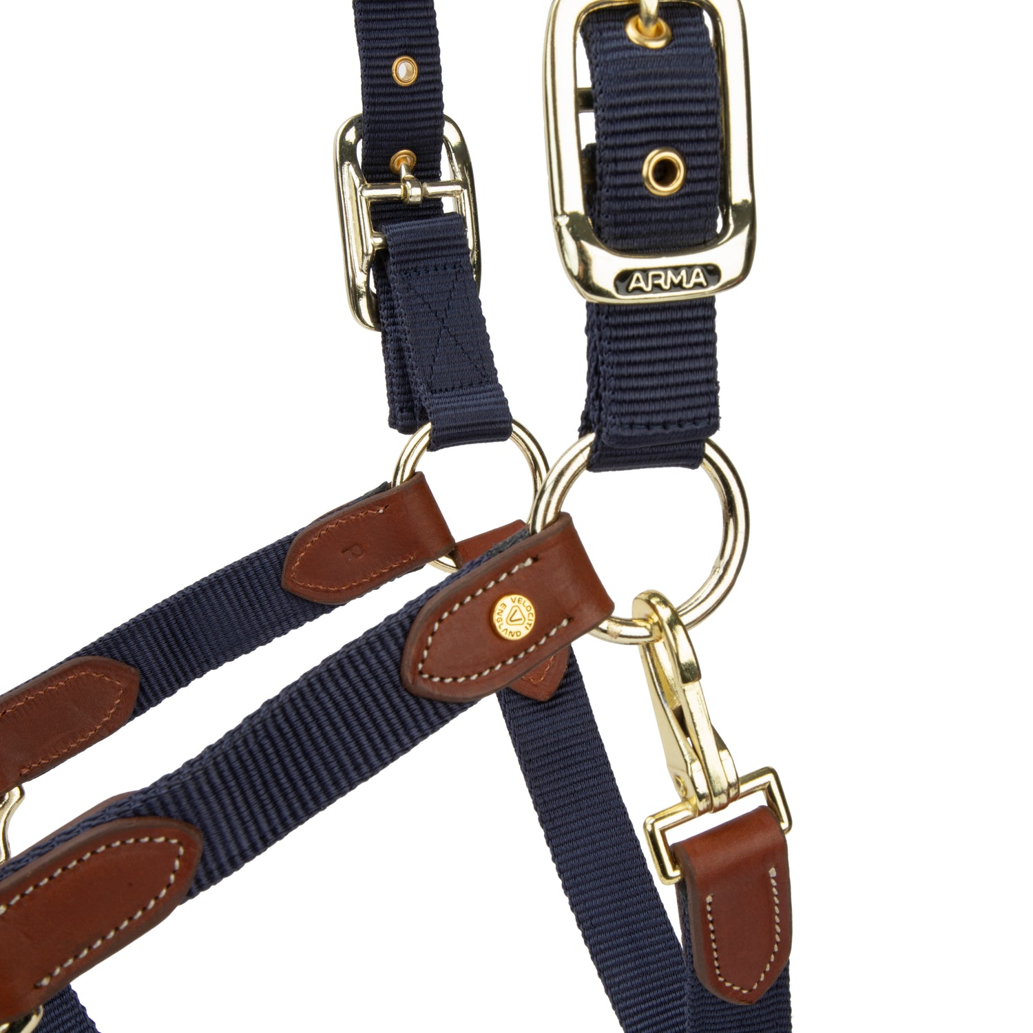 Beautifully finished with leather tabs, the ARMA Porto headcollar offers style with adjustable practicality. The headcollar design features double layer webbing, trimmed and attached to hardwear with attractive faux leather billets. Adjustable both sides of the headpiece and at the backstay with a convenient clip-on throatlash. High shine brass colour signature ARMA buckles and hardwear. Brass colour eyelet reinforcements. Natural colour contrast stitching.