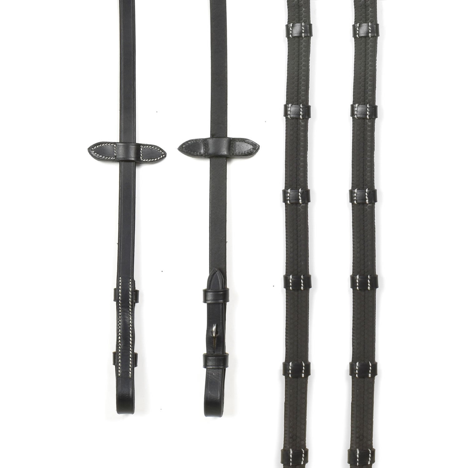 Billet fastening, soft rubber reins with feature spaced leather stoppers for a stronger grip even in wet conditions. The inner of the rubber is reinforced with a nylon inner for extra protection. Crafted from quality leather and rubber with contrast stitching. Create a custom fit, style and functon with the Pick n Mix bridle range.