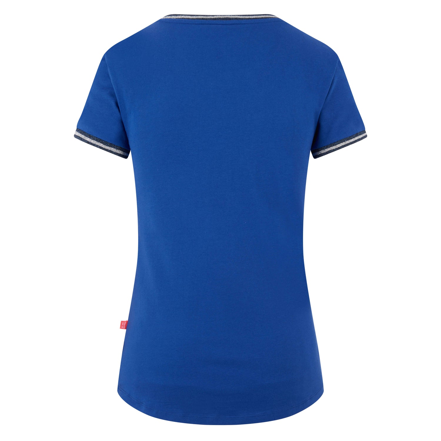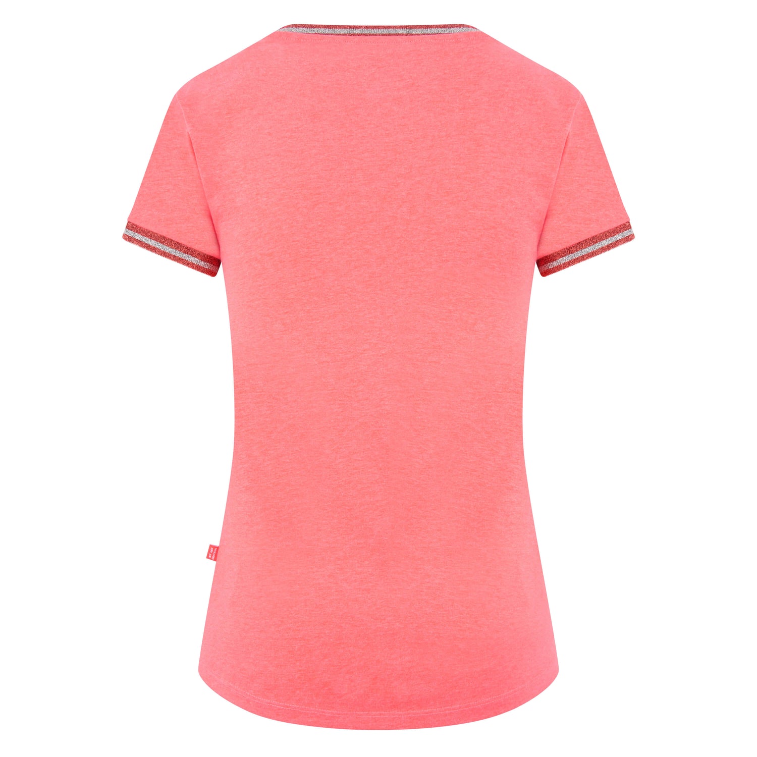 コントラスト色のネックとスリーブビンディングの丸いネックTシャツ。ラバープリントの素敵なアートワークで、スパンコールが上にあります。サイドシームとスリーブと派手なネックプリントにブランドラベルが付いています。