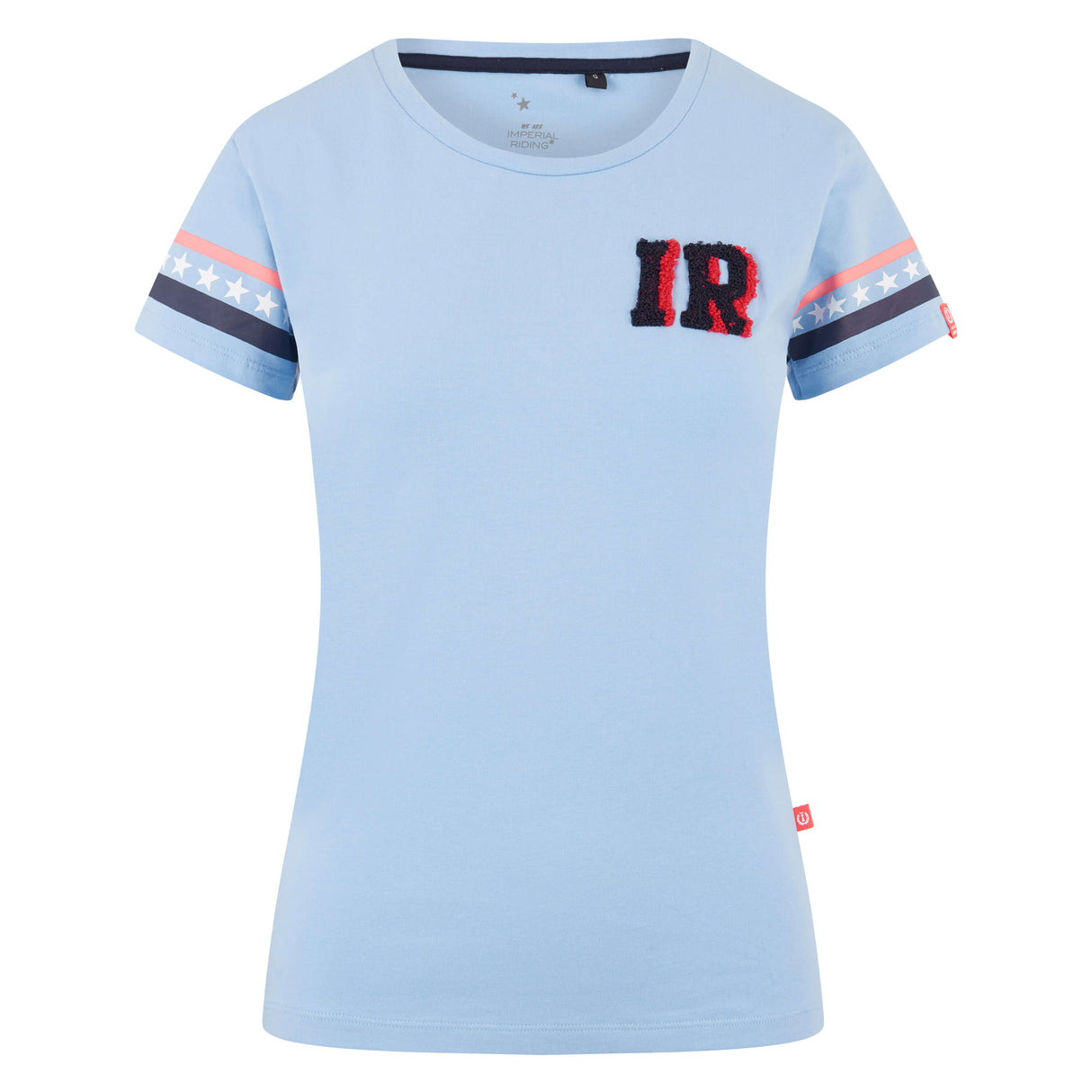 胸にタオル刺繍のアートワークが付いたスポーツラウンドネックTシャツと、袖に印刷されたストライプと星。サイドシームにブランドラベルと派手なネックプリントがあります。