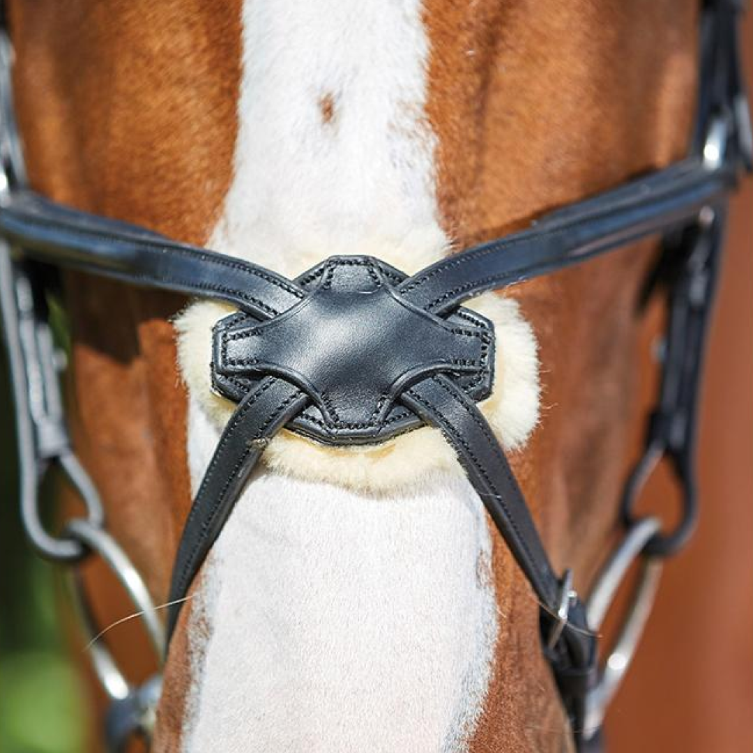Collegiate Comfitec Grackle Bridleは、高品質のヨーロッパの革で作られています。解剖学的ヘッドピースは、全体に超柔らかいパディングを備えており、馬の耳の間でより広い形状になり、圧力を均等に快適に分配しています。快適さを高めるために、ノーズピースにパディングを備えています。鼻を横切るフリースは、簡単に洗うために取り外し可能です。