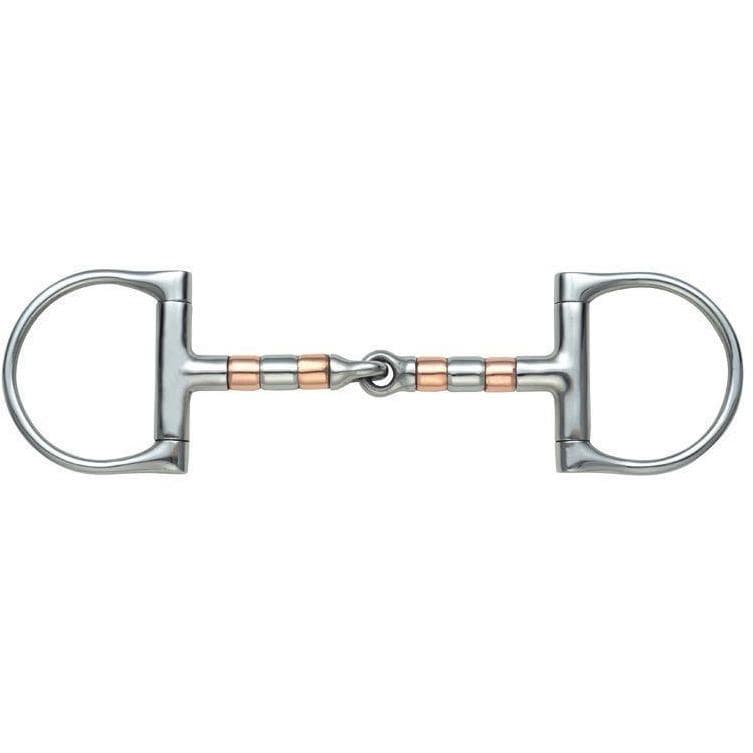 の Shires 銅ローラーマウスDリングスナッフルは、マウスピースに銅ローラーを備えたシングルジョイントスナッフルで、咀嚼を促進し、唾液分泌を改善します。ローラーは、馬がハミをつかんだり傾いたりするのを防ぐのにも役立ちます。