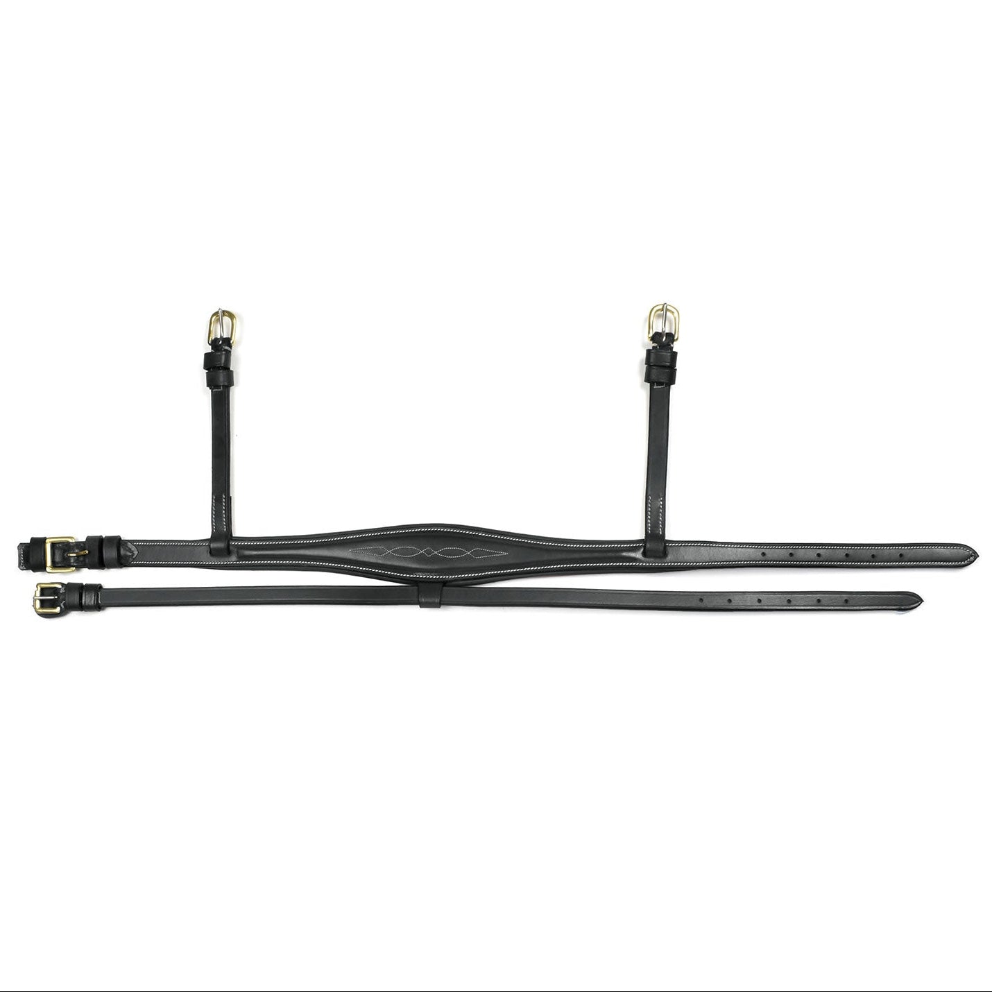 Features a detachable flash strap and will prevent your horse from croasing their jaw and encourages proper contact with the bit, wide padded noseband, raised detailing across top of nose, contrast stitching, stitched motif on noseband, soft leather padding on noseband, buckle fastening and brass hardware. Leather backing on buckles keep your horse comfortable.
